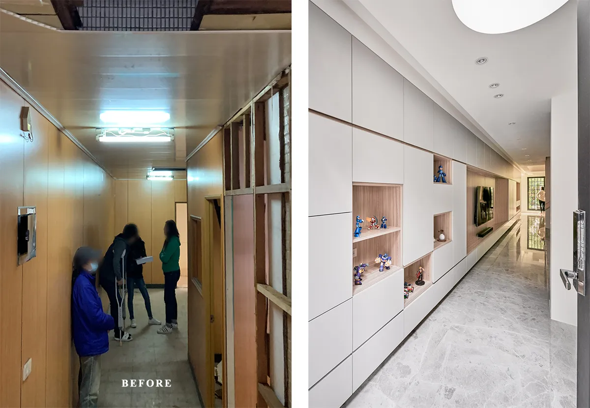 因台灣街廓所致,隨著時間流轉,長型屋已歷經多次汰舊換新,最早從商業空間開始整修,挹注燈光重新型塑、色彩重繪鋪陳。