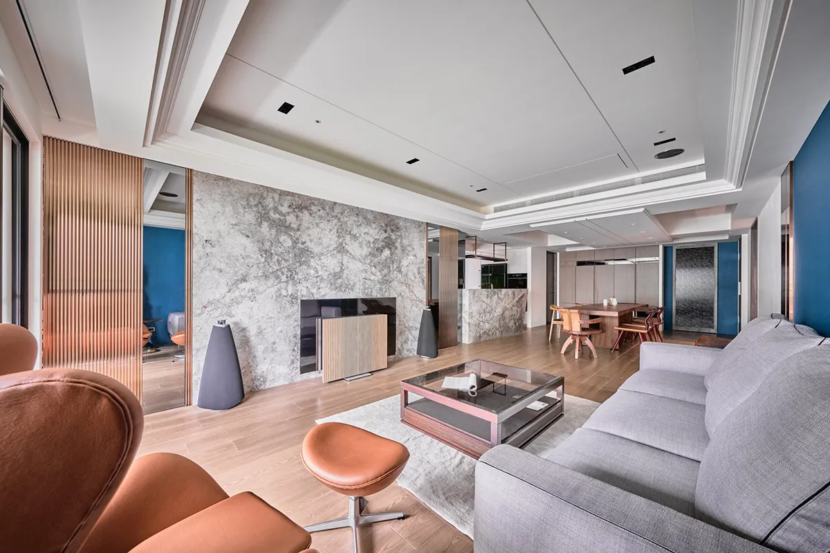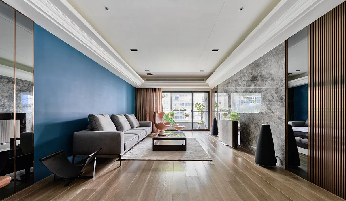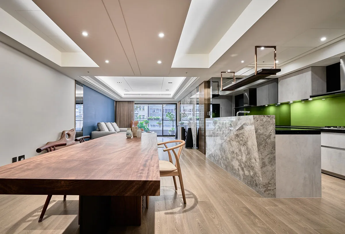 沙發背牆由藍綠色形構日常光景,漆面與石材面正好跳出一緩一重比例,為了圍塑客餐廳互動,悉心以長形拼貼法,勾勒一地縱向木地板,兩域拉大延伸,上方天花亦細細編排了高低線板,設計師說道「多一道線條,便多一處轉折,光影便會穿流於細節處,細膩感也因而加深。」