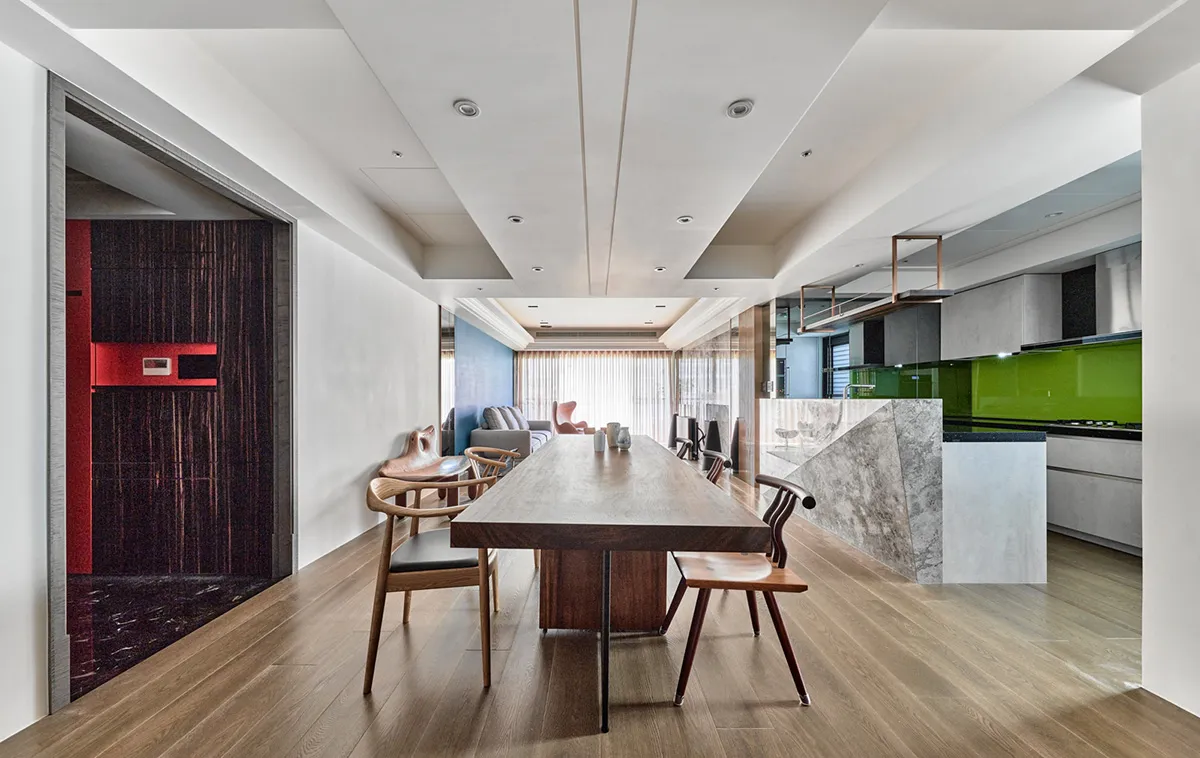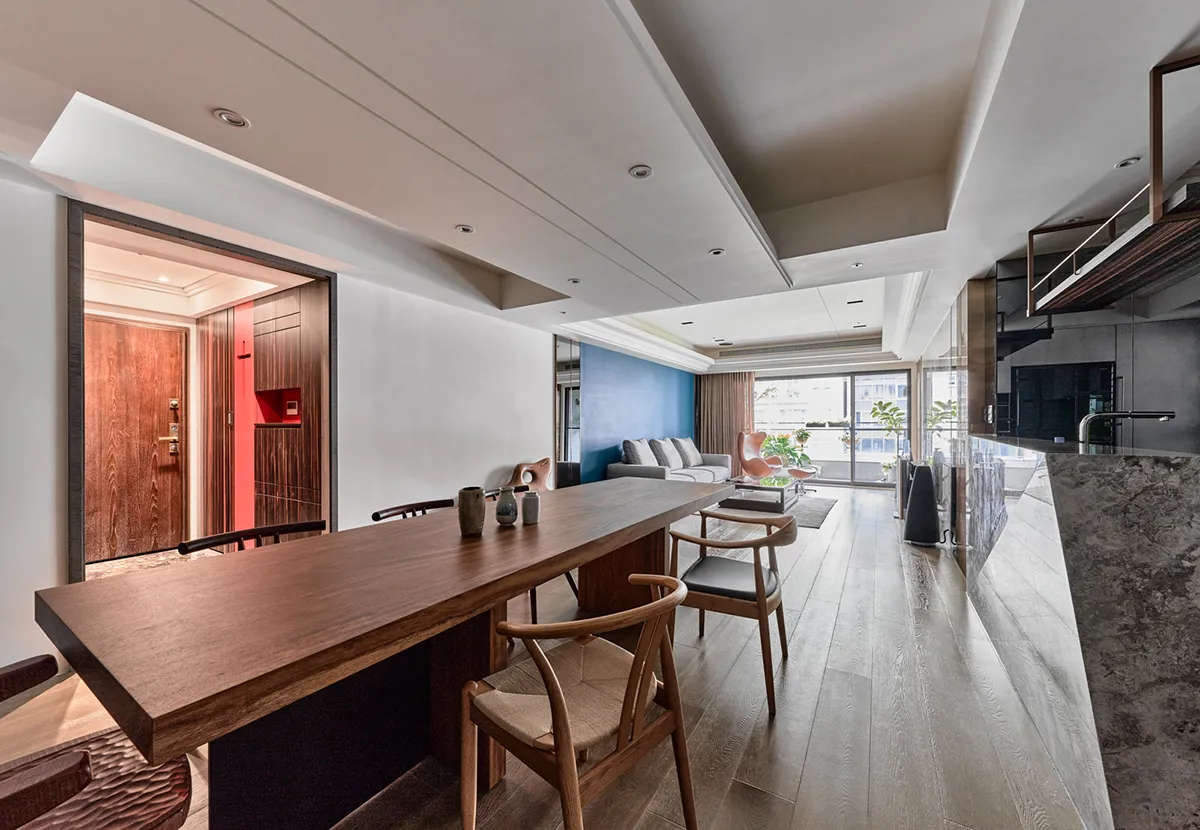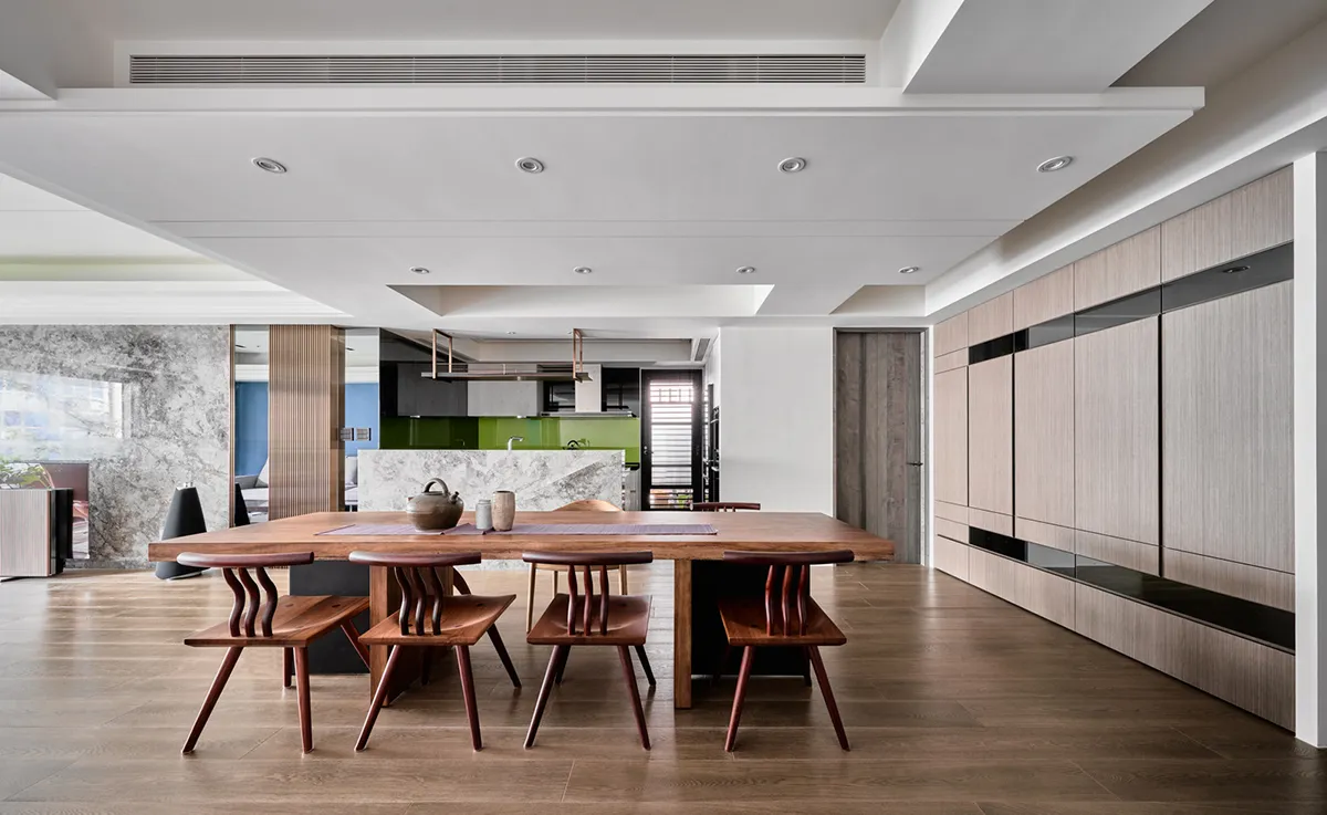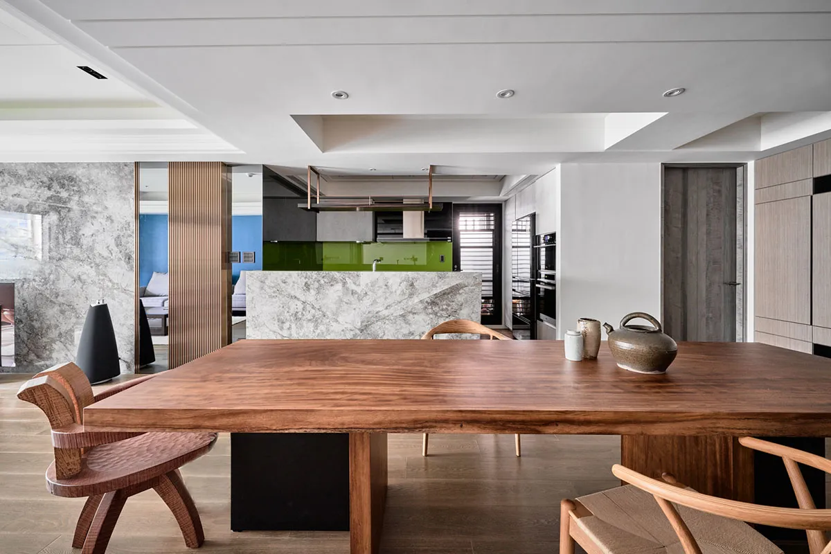 擺置大尺度原木餐桌,成為返家即景,因無爐灶對門風水疑慮,為突顯桌形與場域輪廓貼合,以及視線敞闊尺幅,無垂掛任何燈飾,清朗感讓渡予用餐區,直至一式中島才清晰劃分為界。
