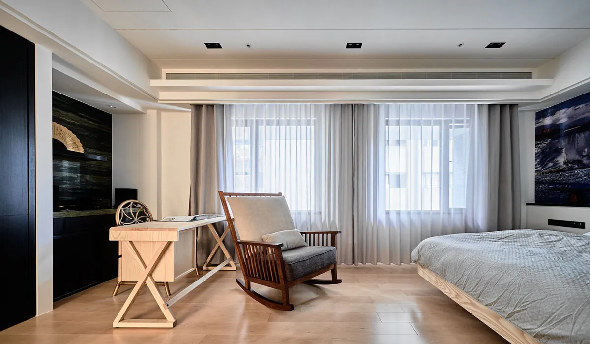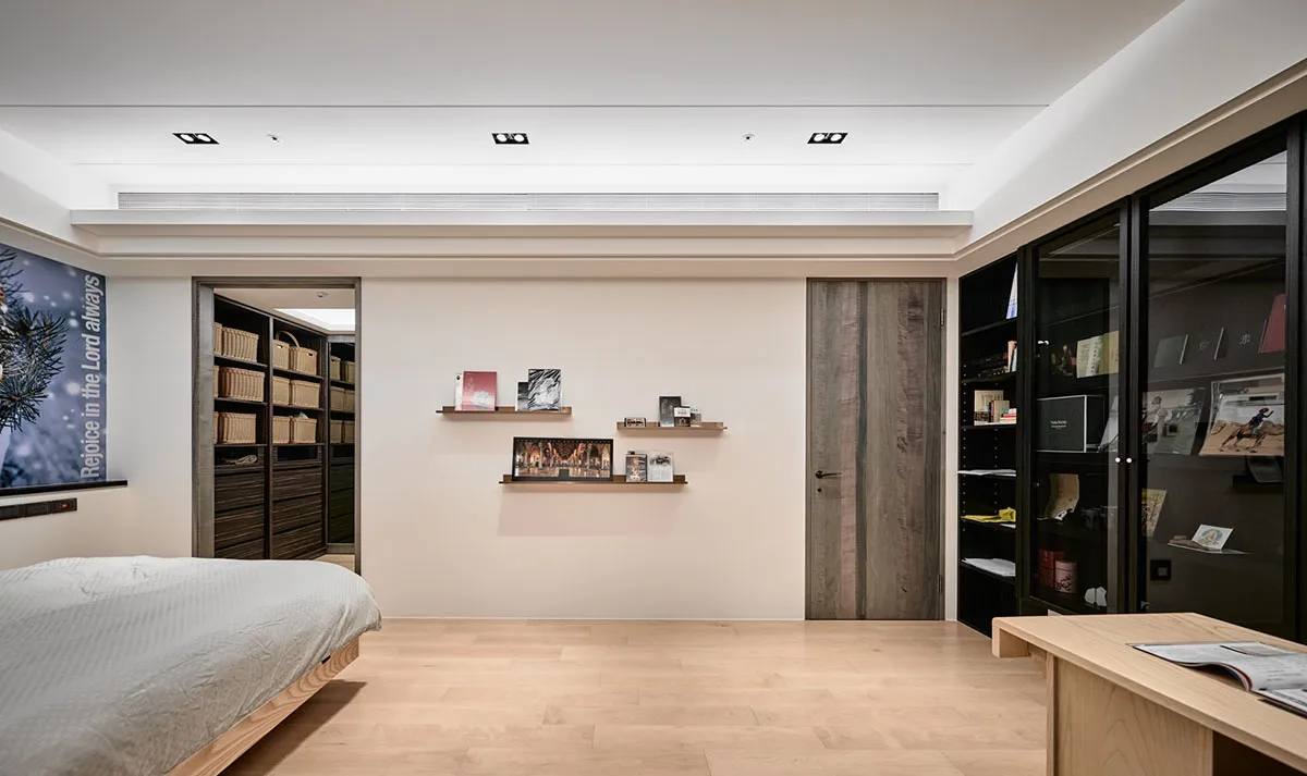 床板在男主人參訪王大閎故居時,突有了靈感,特別喜愛由建築人視角,中西合併簡約線條,設計團隊便量身訂製床架,臥眠區浮顯獨特之美。