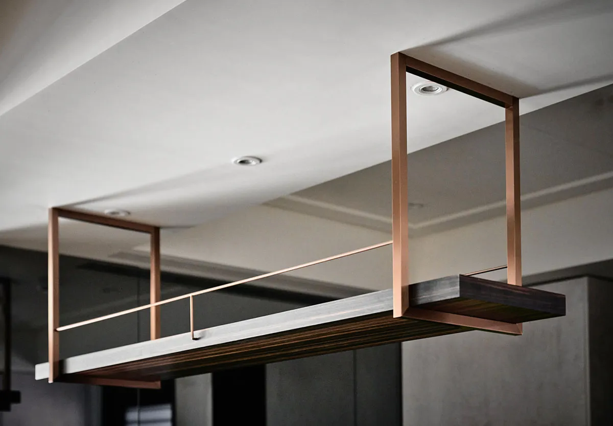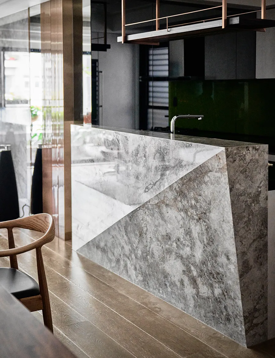 為了篩去料理物品所形視覺雜亂,在高 85 公分中島檯之側,上方形塑一式鍍鈦為邊的吊杯架,下方築起一道銀灰珍珠石壁面,刻劃出彷如鑽石多角面向,構成立體樣態立面,讓視軸有了多角趣味。