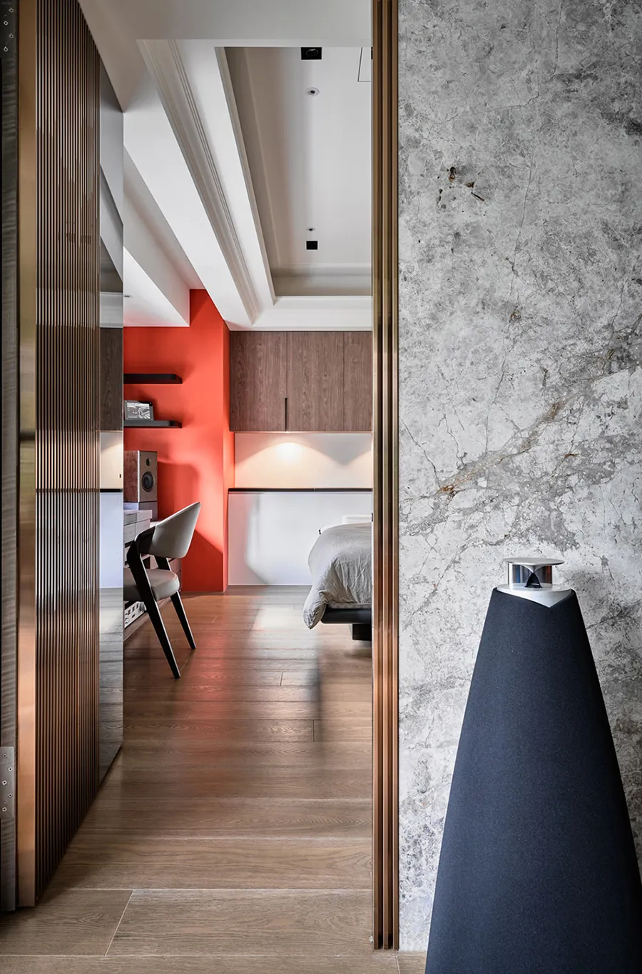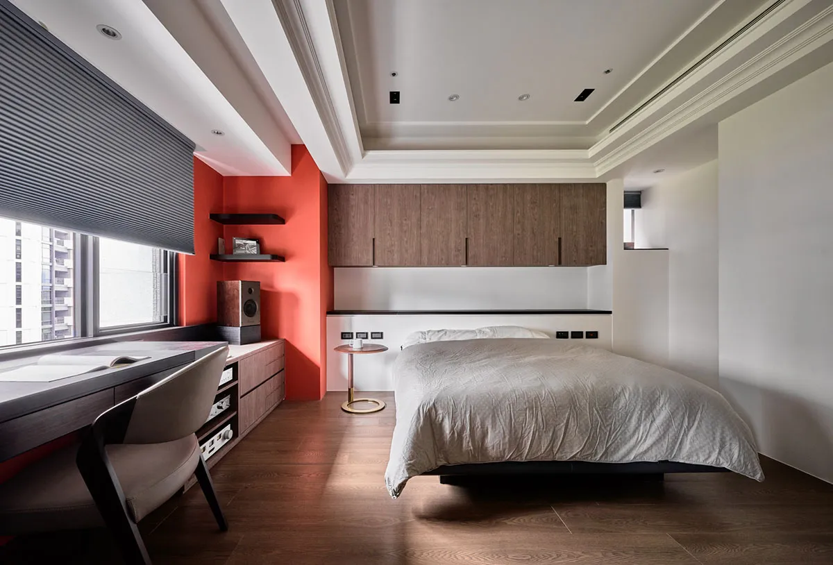 臥房面處林蔭大道,於迎光面以橘紅色點綴,考量房內坪數不甚公領域敞亮,木皮紋理需順隨場域大小而異,依遠近視角決定肌理大小,櫃面選擇稍稍細緻柚木皮,並襯以胡桃木為面。
