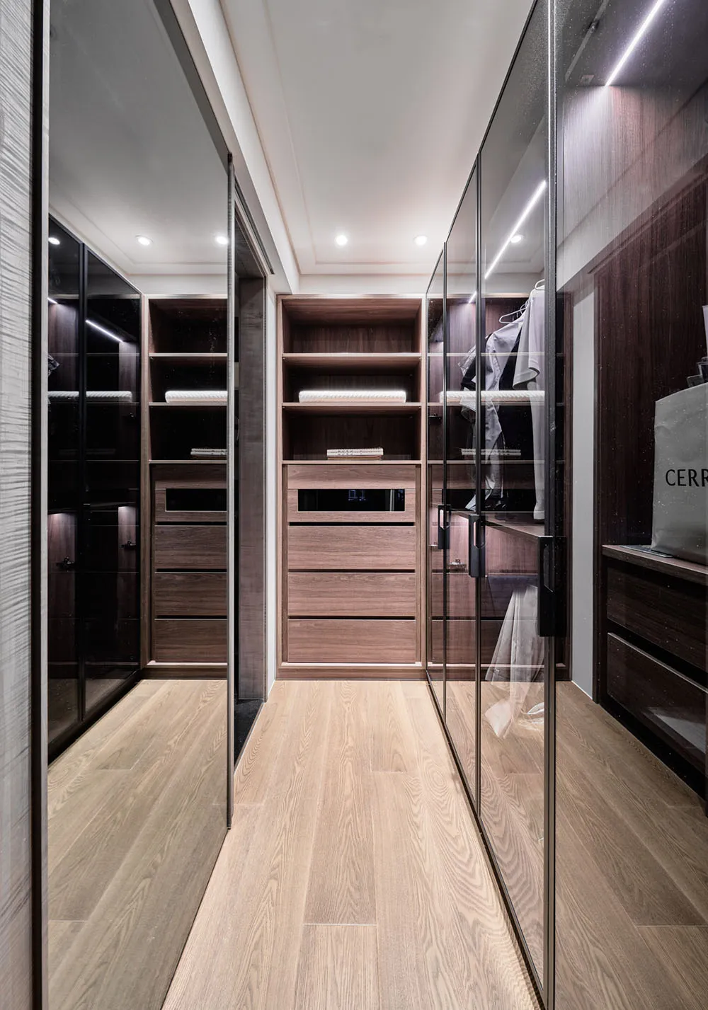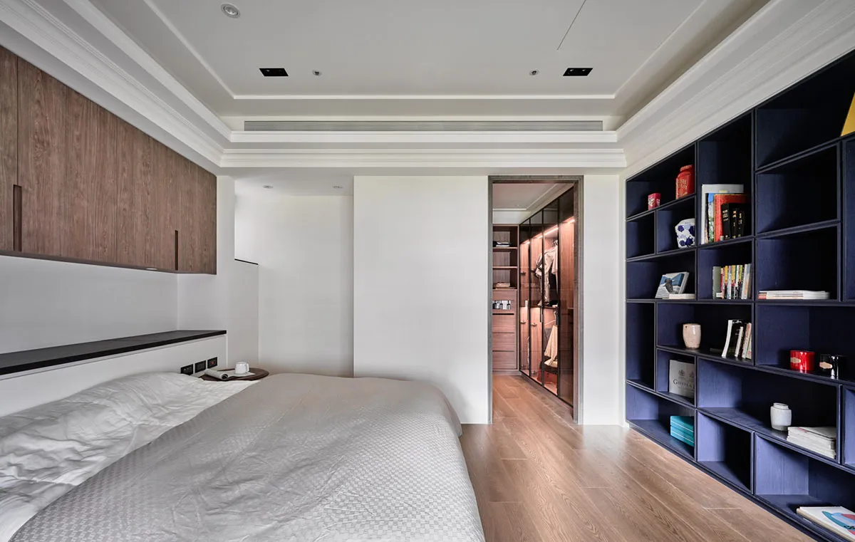 男主人希望出入更衣室時,無任何門片阻隔,意謂與主臥之間,須以更加通透、緊密方式連結,書櫃便取決入更衣風格之主要量體,特意形塑染深藍橡木皮色為邊框,以不同大小與形狀,推升了使用靈活度與語彙之巧妙性。