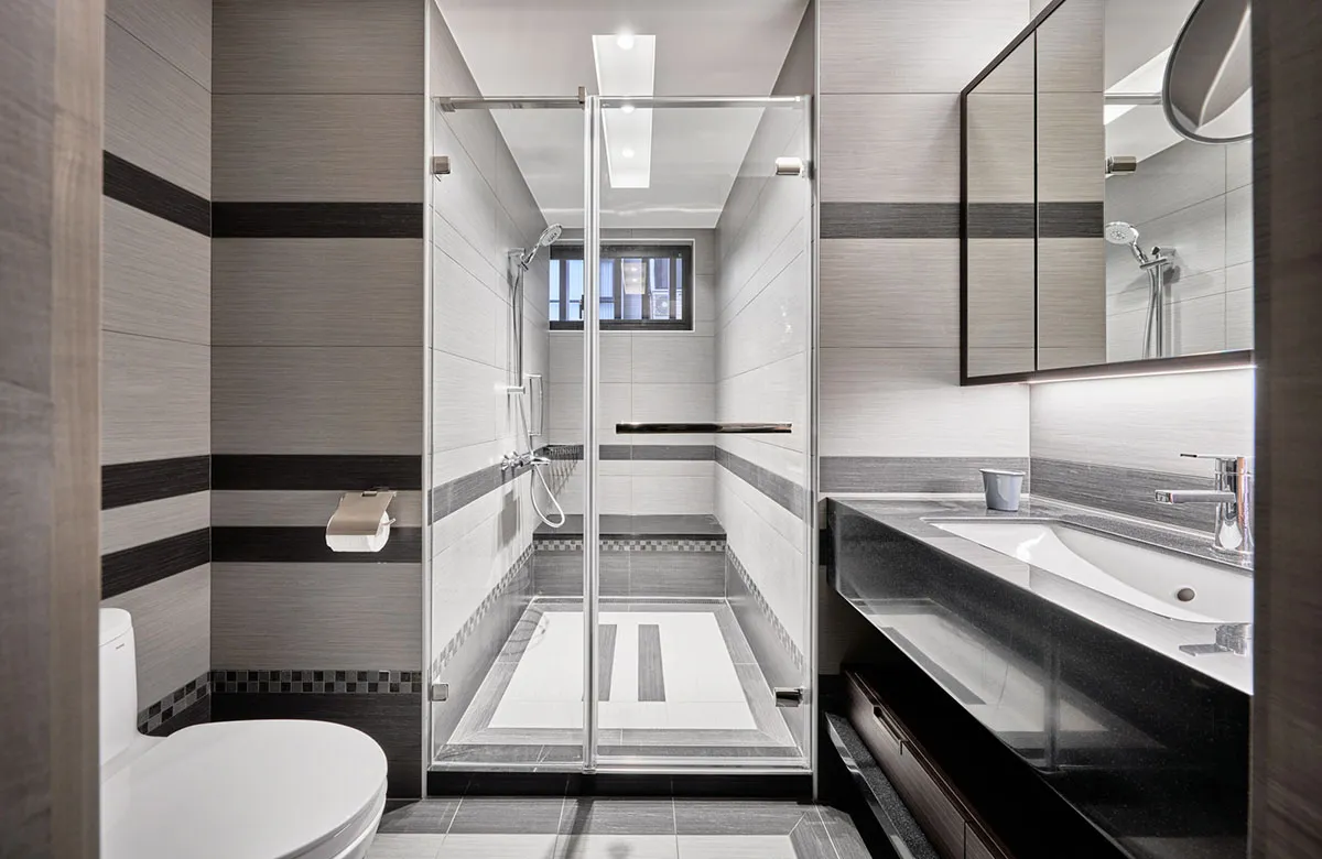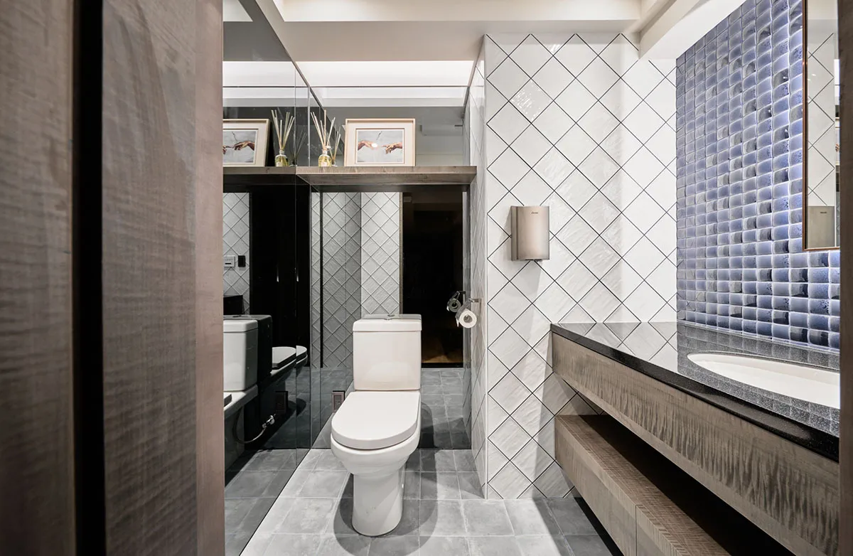 主衛浴由更衣室進入,將原本坪數較大衛浴,讓渡予更衣區,因內部公共管線不可挪動,將浴缸拆除後,以沉穩幾何線條描摹為風格主調。