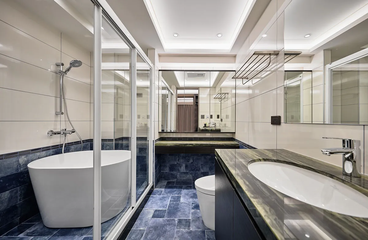 以精緻手法形塑小坪數客浴,綴飾整道鏡面,放大坪效,盥洗區選擇凸面小麵包磚砌牆,長形鏡刻意置偏,烘托雅致質地。