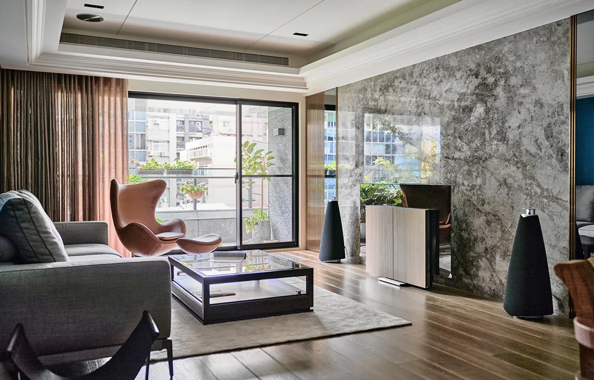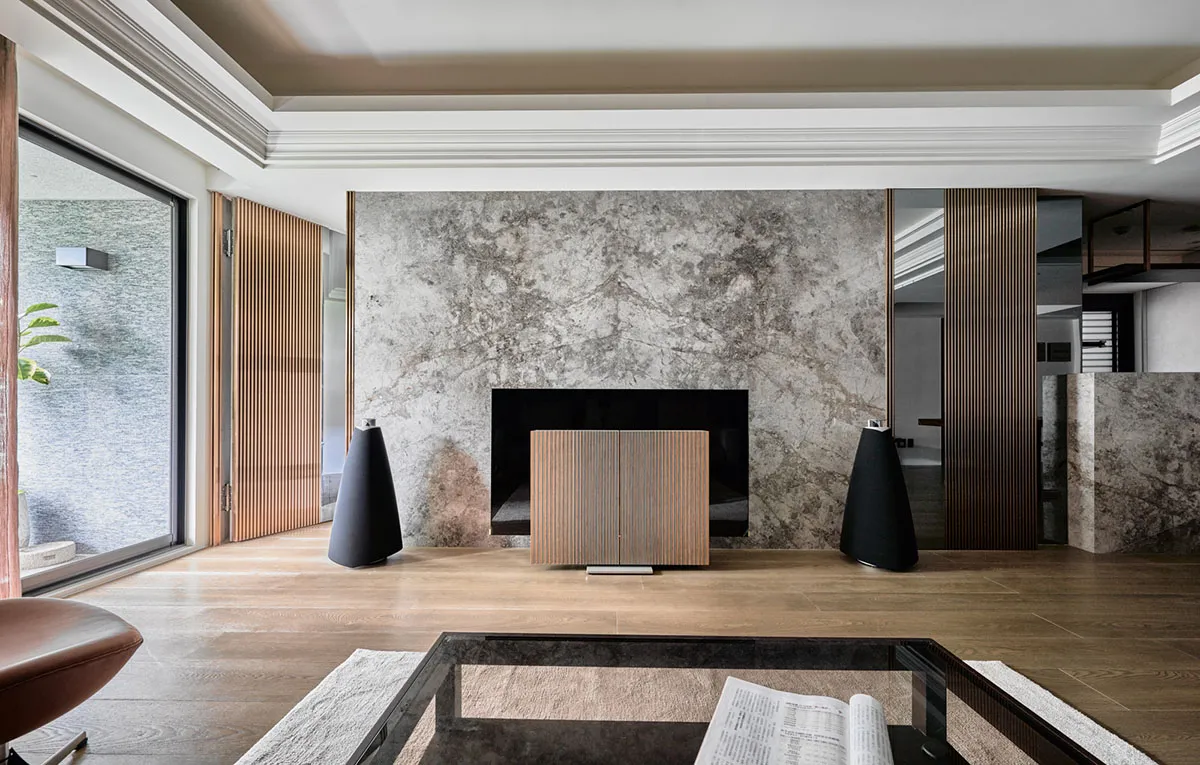 為顯豐厚大器姿態,不僅以銀灰珍珠石面為主牆,在總達 5 米 2 長度下,以對稱手法切分,左右分側藉由鍍鈦格柵線條與灰玻穿引,左側為進入男主臥門片,右側僅以裝飾性樣式示面,滿室律動除了從對稱比例顯現,石材也由餐廳中島流動至此,化顯了整體一致性。