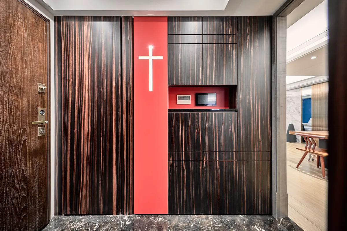 信仰是夫妻生活重心之一,為使返家即見心中圖騰,設計團隊引用由內透映、煥發暖光,將十字架造型作為一盞壁燈,不僅化顯了印記,亦將信仰虔誠之愛,以富寓意方式呈現。