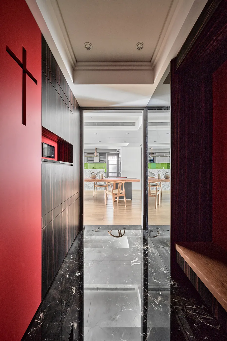 嘗試了不同色系後,以具有歐風質調的紅色,與黑檀木相互襯托,反而一展大器風範,同時引入金色絲紋的金鑲玉石材,使獨立落塵區,圍塑出層次感。