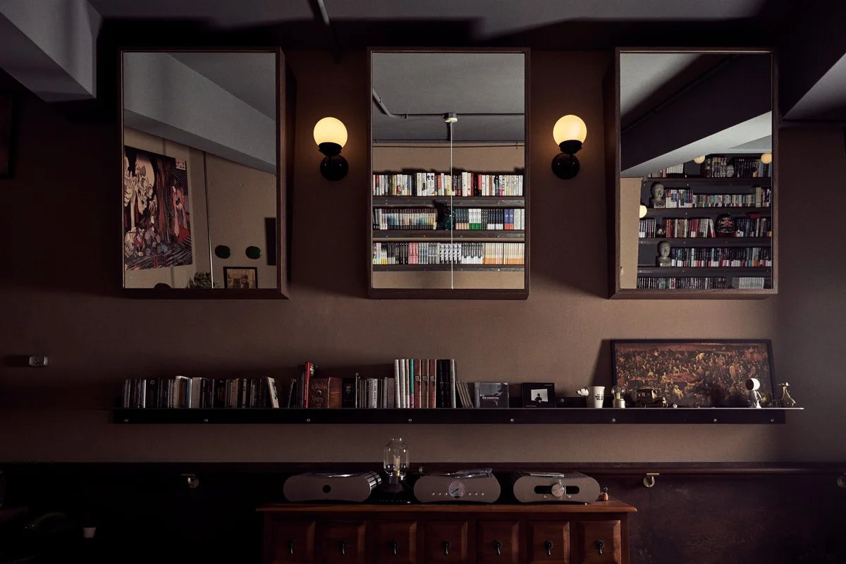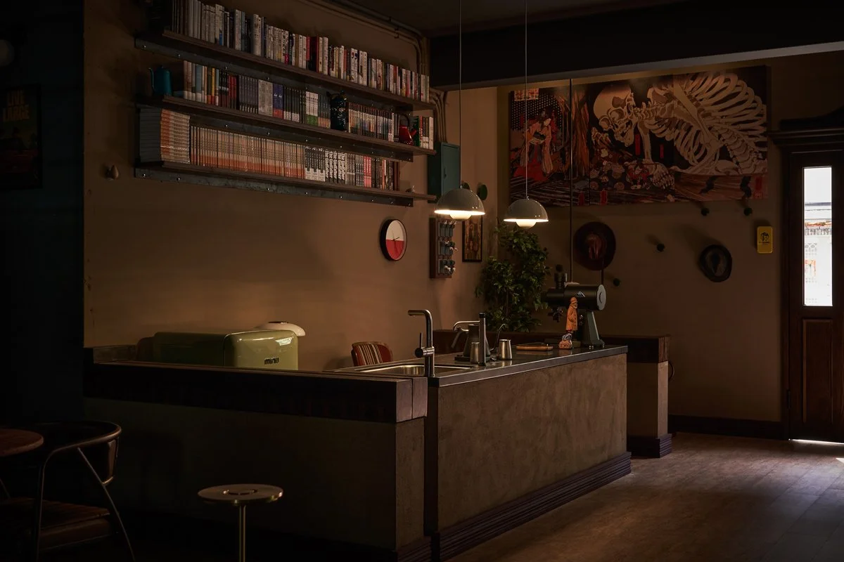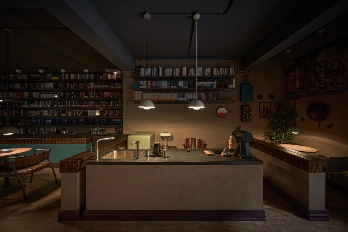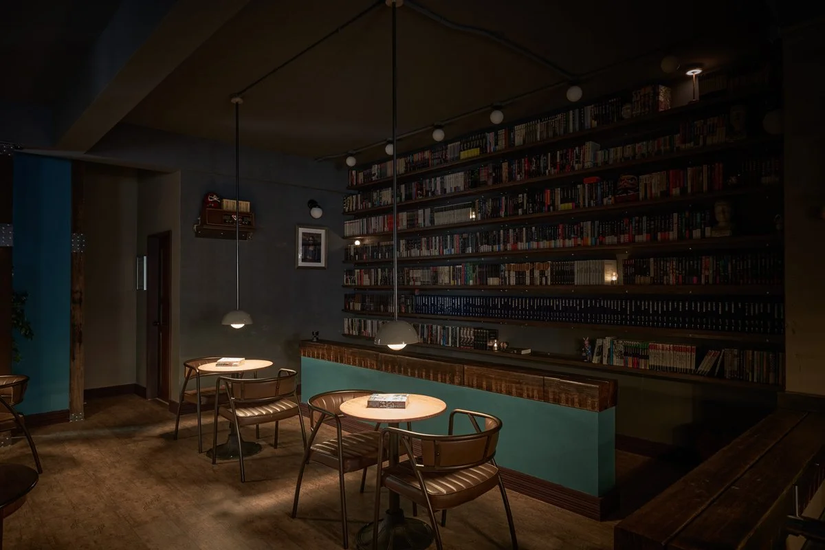 當你推開那扇沉穩內斂的木門,印入眼簾的盡是店主的珍稀收藏,伴隨著溫潤清雅的咖啡香,撫著歷經歲月的枕木年輪結構,復古懷舊的氛圍彷彿述說著時光長河留下的軌跡,心也慢慢隨著步伐沈澱下來;從櫃檯牆面延伸至屋內深處的書牆,展示著店主在生命旅程中的自我覺察與省思歷程,特意安排的書櫃動線設計和書籍的精密擺放方式也象徵著對於書籍作者和藏書的尊重。