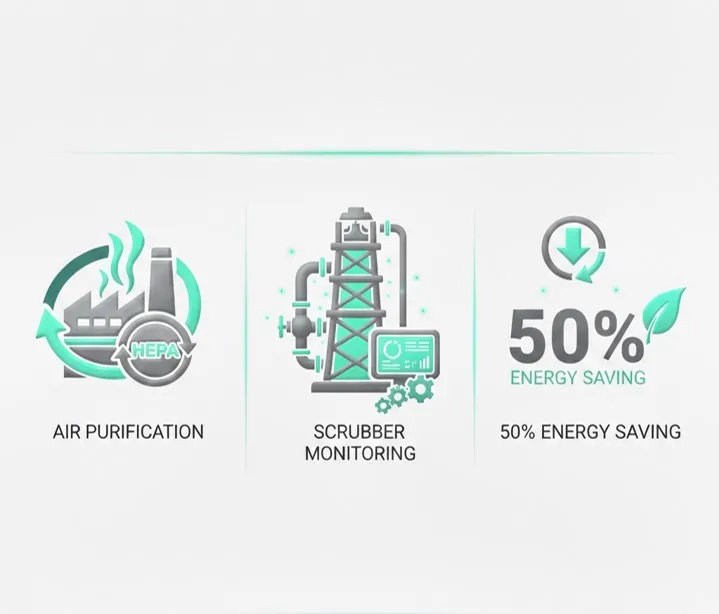 空氣淨化與洗滌塔系統 導入空氣淨化系統,減少污染物進入電鍍槽, 提升沉積效率; 搭配洗滌塔的全自動監控與專用泵浦設計, 能源消耗降低達 50%