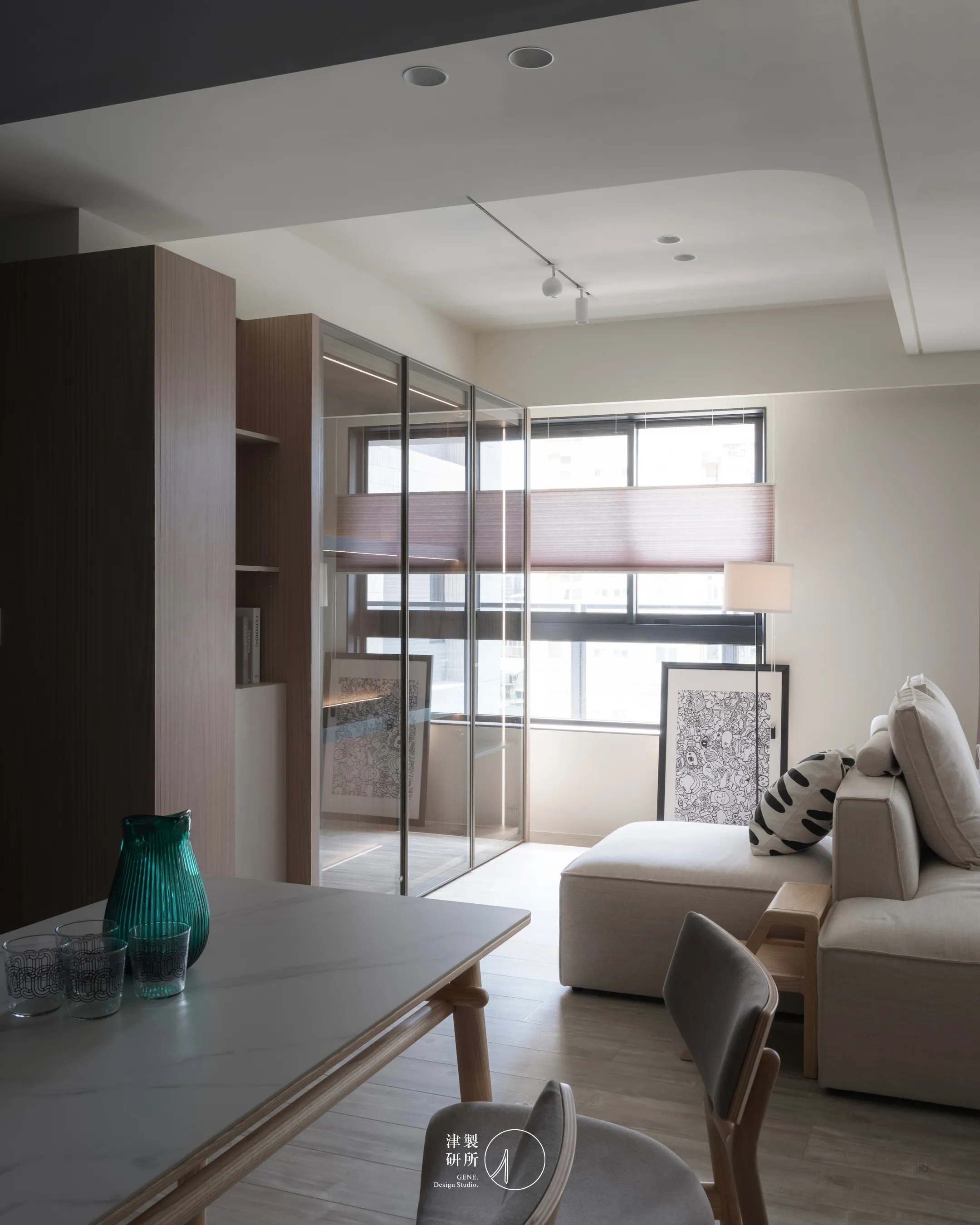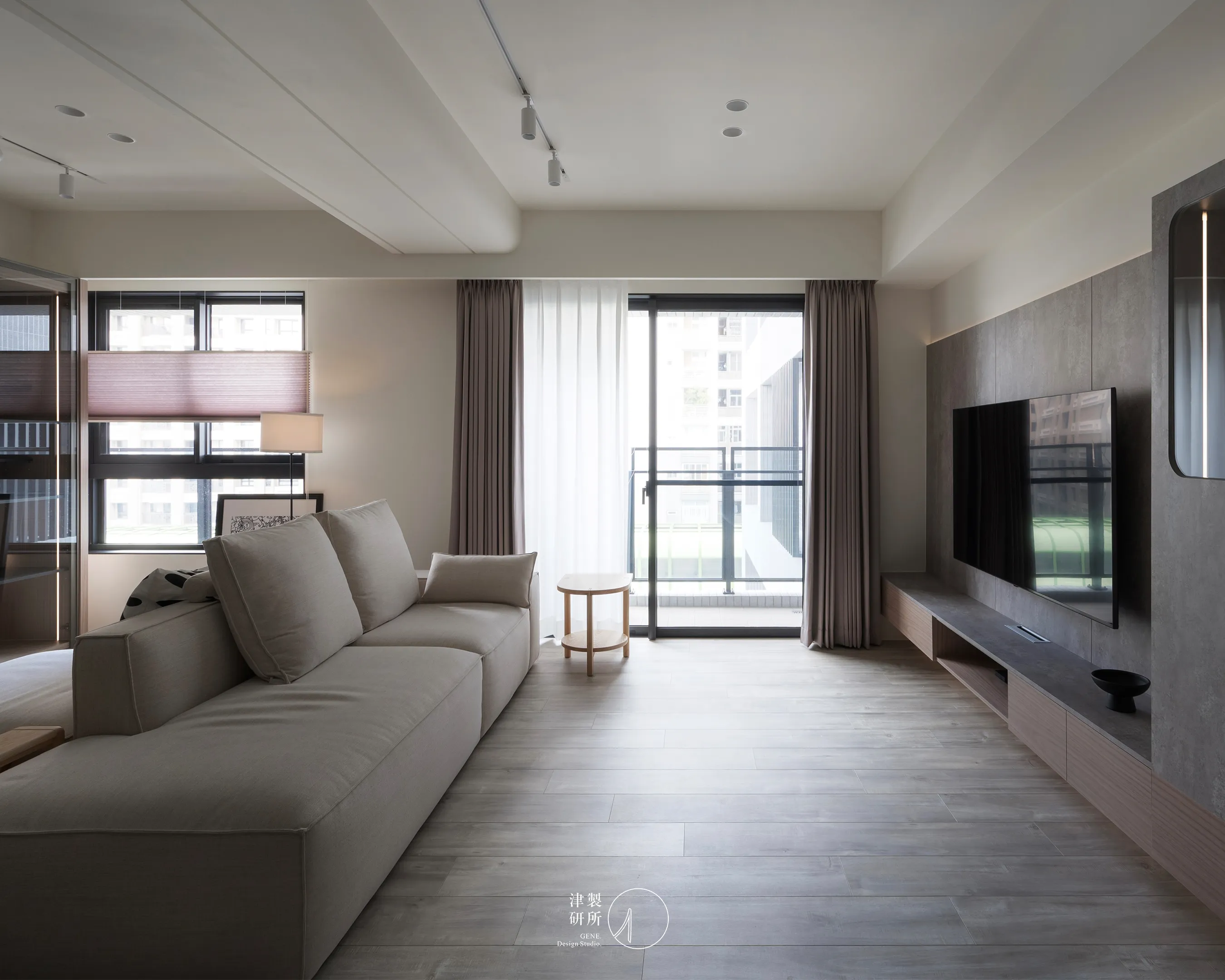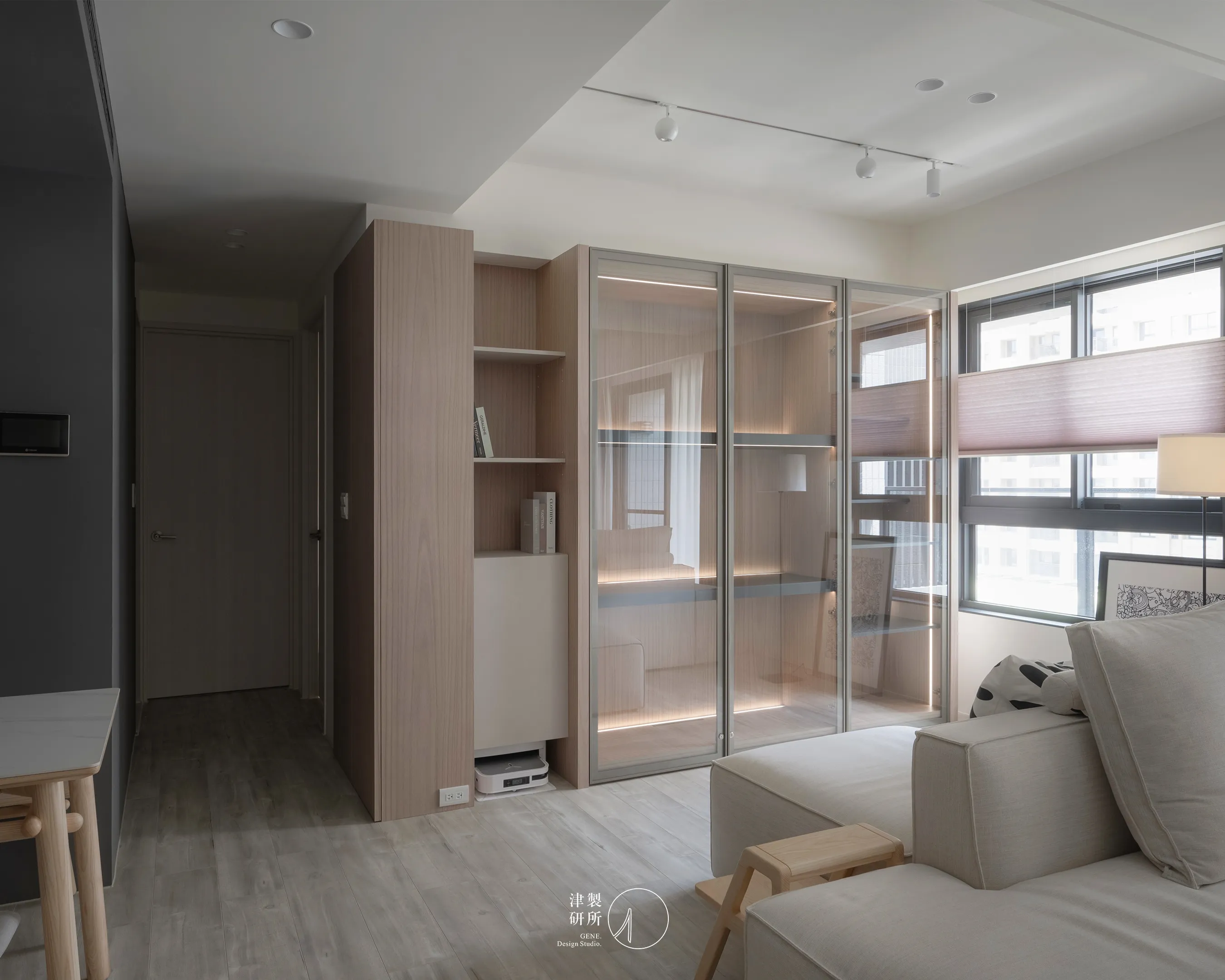 無方向性的沙發擺設,靈活呼應著不同的空間與生活情境。深色調的延伸與連貫性,不僅界定了空間的高低層次,更巧妙地將視覺焦點引導至當下的使用情境。暖灰、米白、淺木色的和諧搭配,在柔和光線的烘托下,營造出寧靜舒適的氛圍,讓每一次生活行為都被溫柔環抱,體現簡約充滿生活感家。