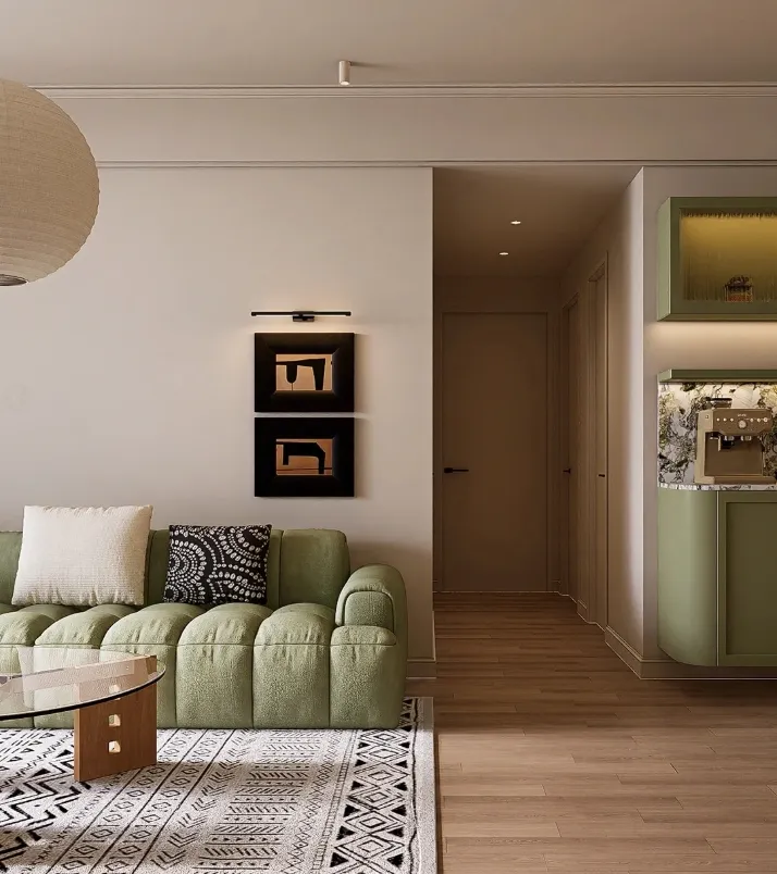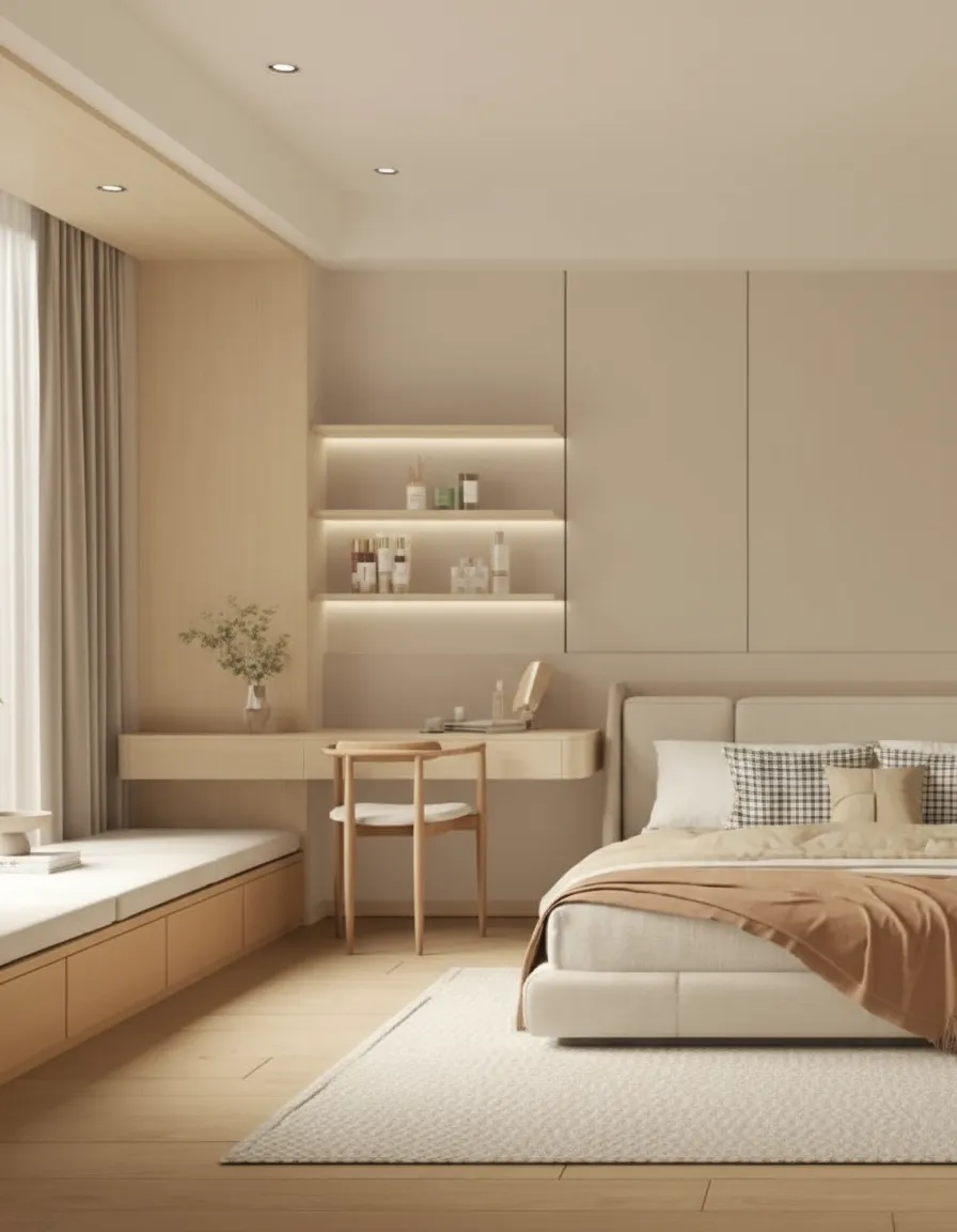 以奶油白與淺木為主調,利用自然光與薄紗簾打造柔焦空氣感。家具線條簡潔、邊角圓潤,空間保持乾淨留白。
