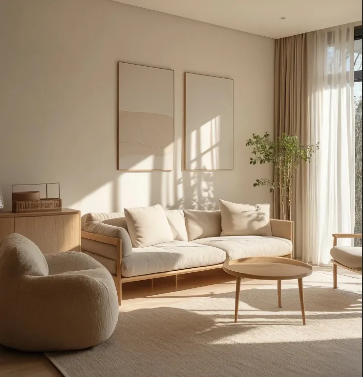 **關鍵字**:奶油白 × 原木 × 透光紗簾 × 柔霧暖色