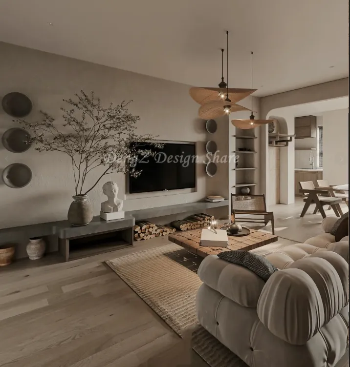 以低飽和的灰米色系為主軸,搭配木質、藤編與石材等自然素材,讓空間保留手作的痕跡與不完美的質感。