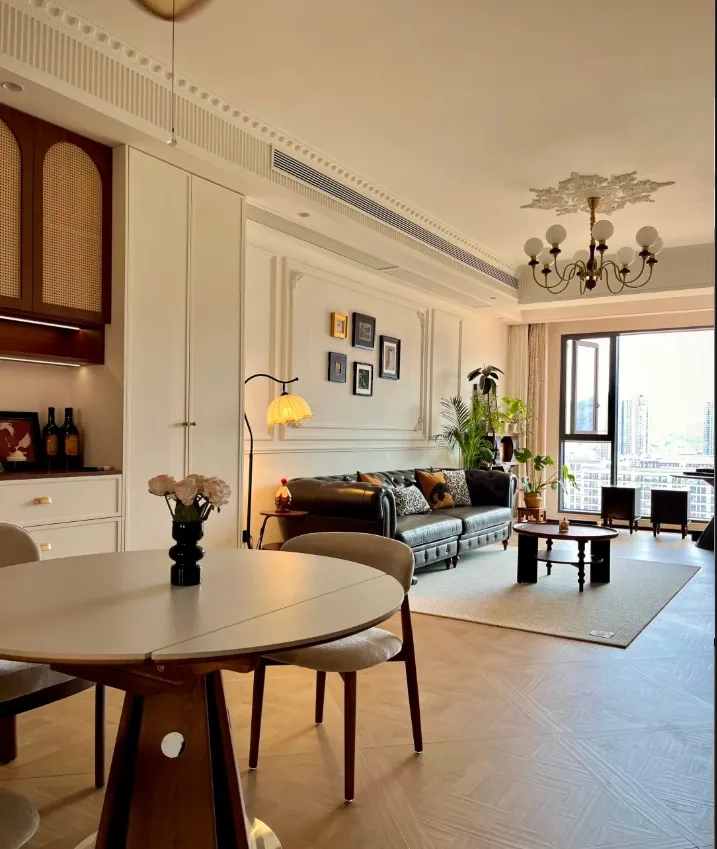 以典雅線板牆與金屬吊燈勾勒法式輪廓,結合皮革與木質家具,營造高雅又溫潤的氛圍。
