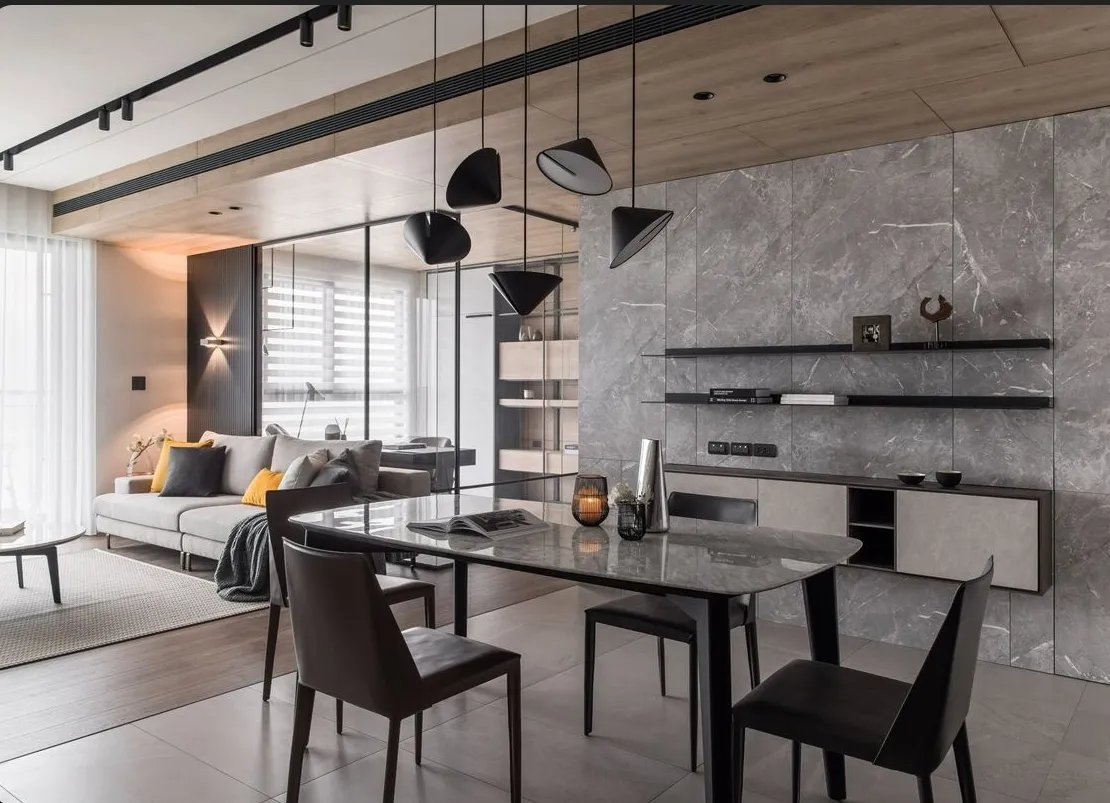 以中性色為基底,結合不同材質的對比:石紋牆 × 淺木天花 × 黑鐵元素,在剛與柔之間取得平衡。