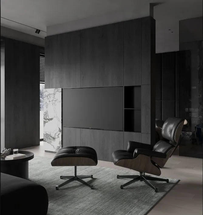 **關鍵字**:線板牆 × 暖黃光 × 深色皮革 × 古典金屬