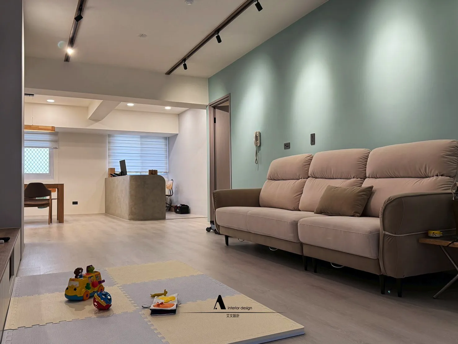 全屋通鋪木地板搭配湖色牆面,
