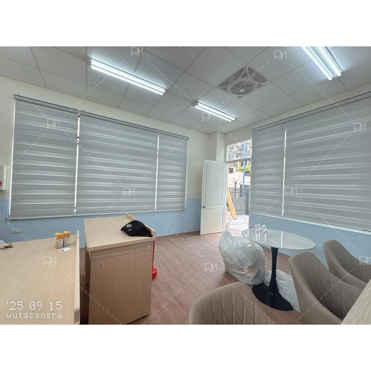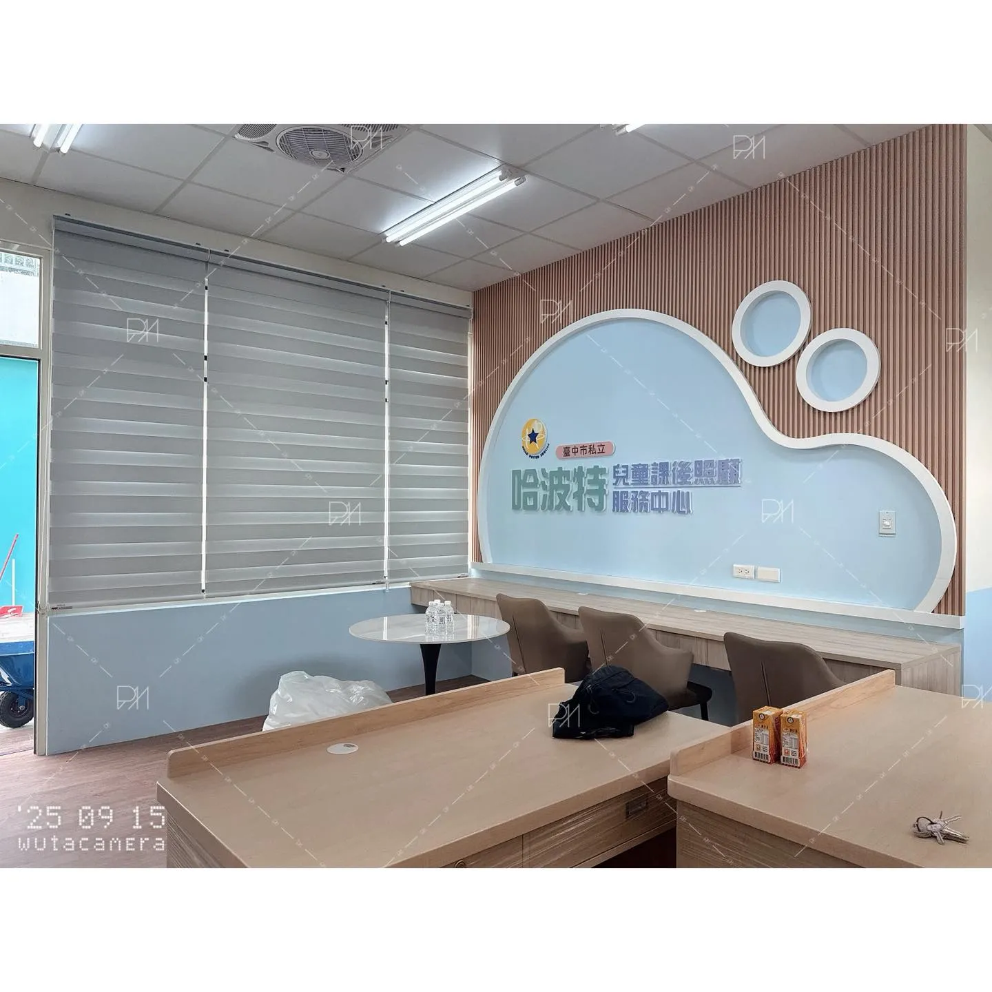 前台接待區:柔灰色調光簾讓光線自然穿透,同時保留隱私與整潔感。