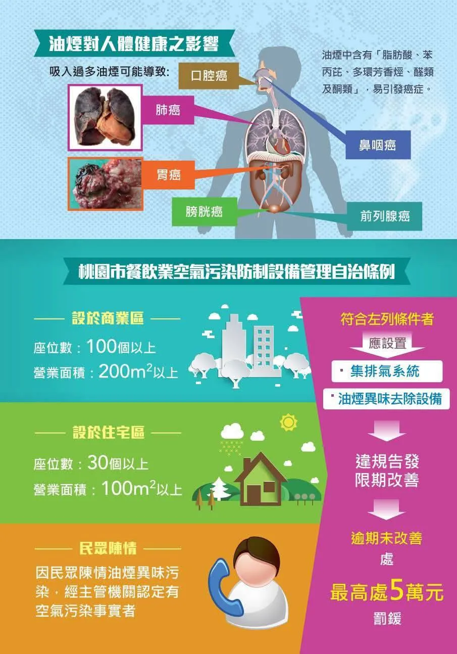 餐飲業者請注意!為維護空氣品質、降低油煙污染,餐飲場所應確實安裝並定期維護油煙處理設備。