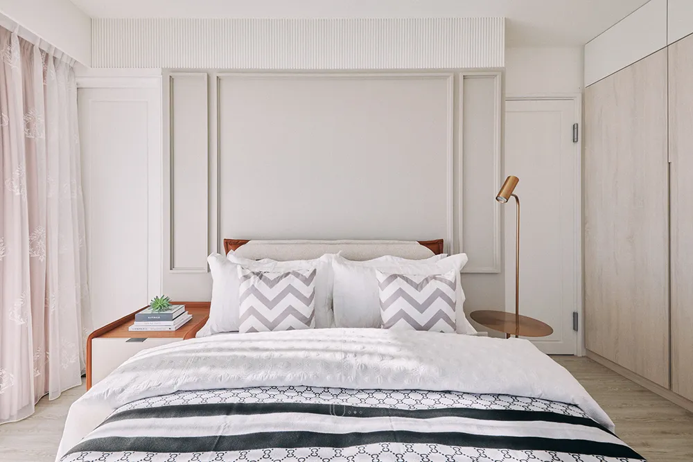 美式古典是結合優雅與復古感的一種設計,而新古典則是跳脫以往對宮殿既定框架,從原本深色為主的配色概念,改成以淺色、明亮為主。再結合一些美式元素,如圖中的:美式線板、大理石紋理,將優雅與復古取得一個平衡。
