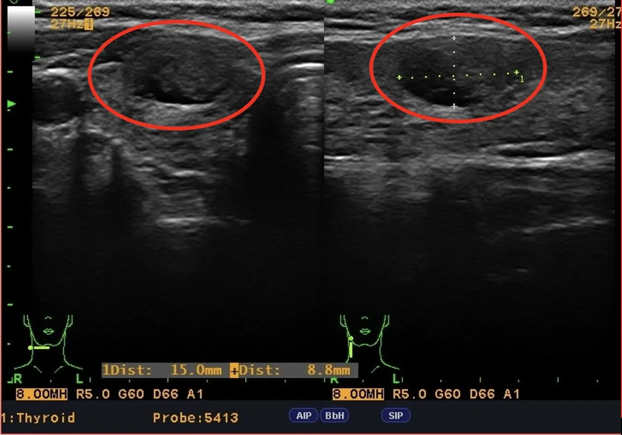 🩻甲狀腺超音波意外發現:右邊甲狀腺有一顆1.5x0.9公分的結節,雖然超過九成的甲狀腺結節是良性的,但是我們還是安排患者做進一步甲狀腺細針抽吸細胞學檢查。