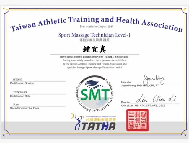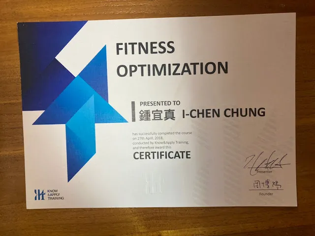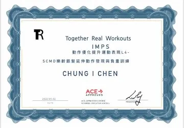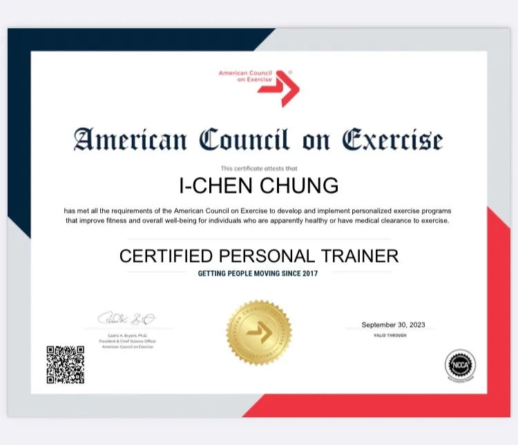 Jenny擁有國際認證的四大證照之一: 「ACE美國運動委員會認證私人教練」(2017)