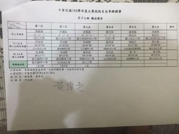 2016年大專盃自由車賽成績表 / 圖片提供:吳秉聰