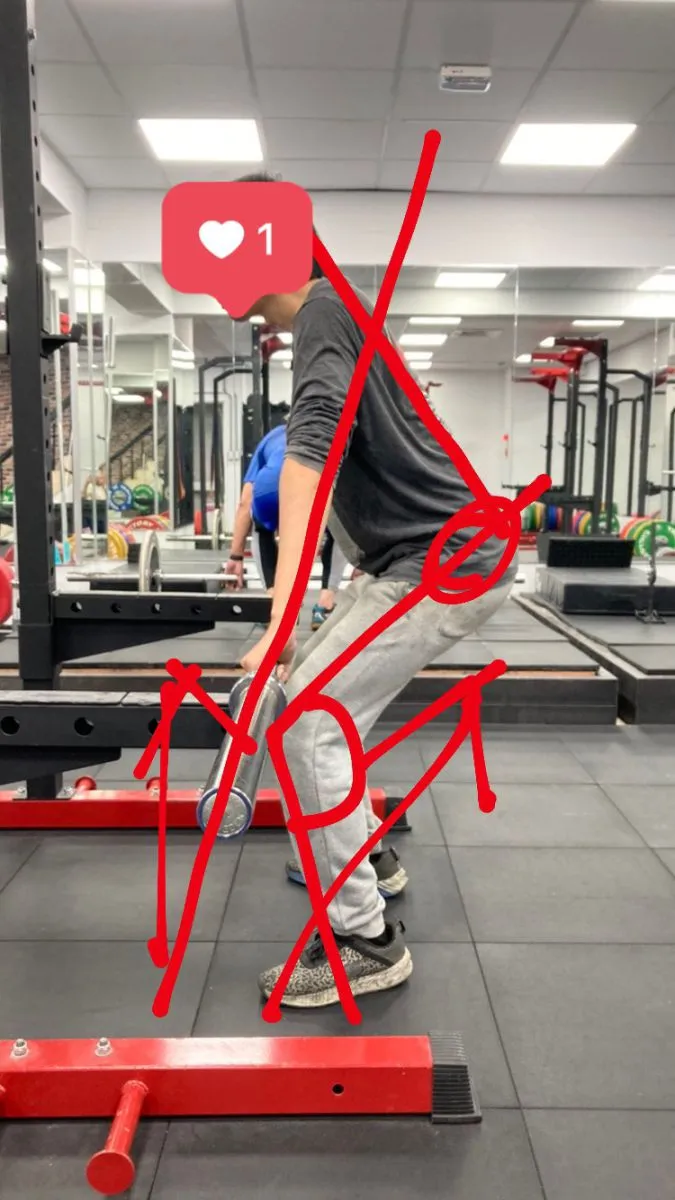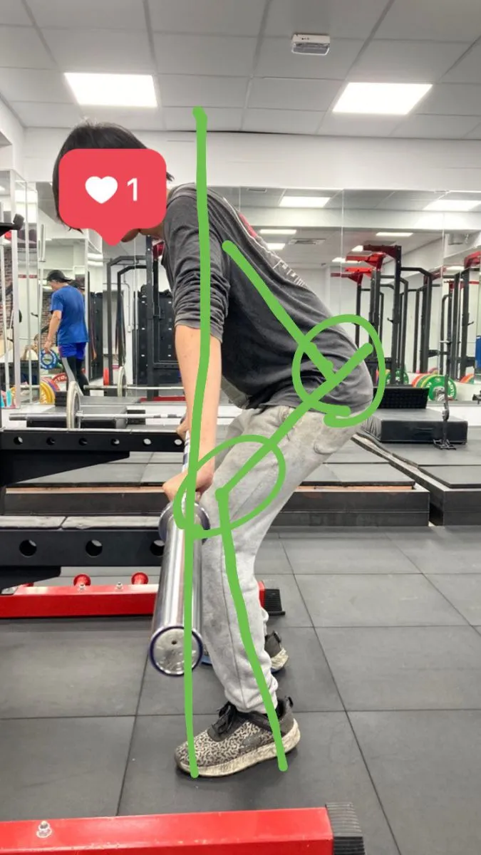 硬舉主要是訓練下肢拉的腿後肌群動作,但是因為手臂抓著不算輕的槓鈴重量,很容易用慣性的動作:上半身,拉起來槓鈴。這時候身體的結構會變成重量從地板起來往斜上方走,實際上形容,就是讓腰部受力過多。(如上圖紅色線條圖示)