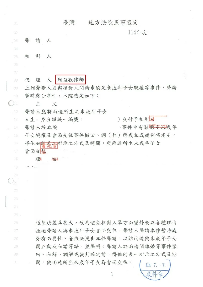 芝芝律師替離婚案件的當事人爭取到暫時處分裁定,因對方不交還子女,故法院裁定對方應交付子女,且對方只能於特定時段探視子女。