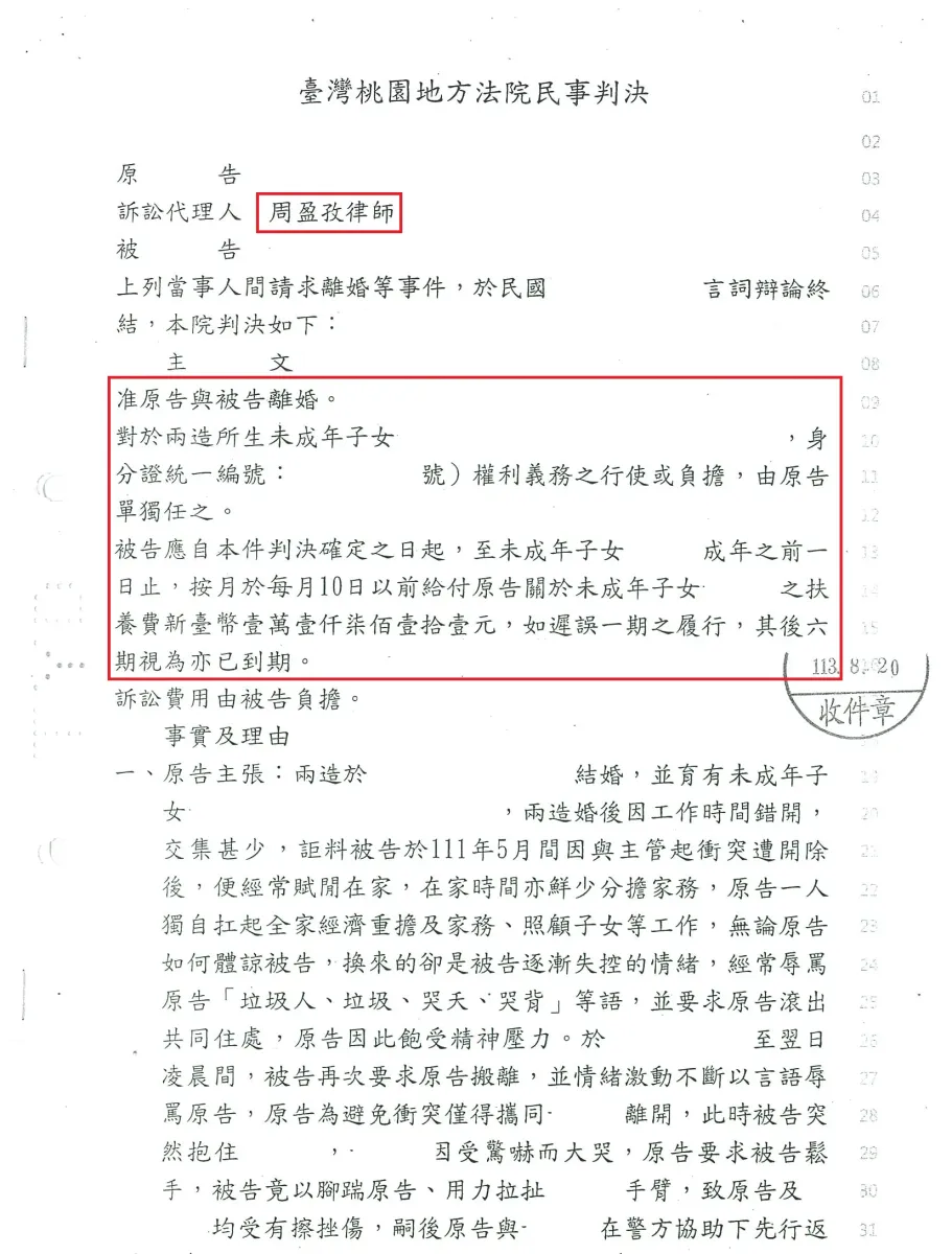 芝芝律師替當事人爭取到離婚、小孩監護權、扶養費,讓當事人告別不合適的婚姻關係,並爭取到小孩的監護權:
