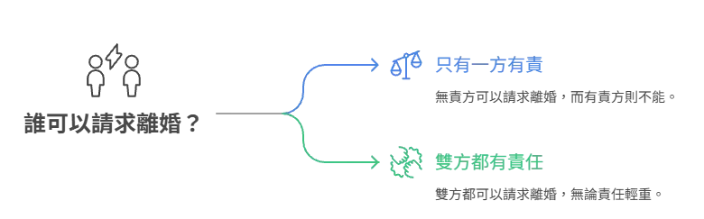 - 只有無過失的一方可以請求離婚 依《民法》第1052條第2項規定,我國採「破綻主義」,當婚姻關係已出現重大破裂且難以維繫時,只有在配偶其中一方無須對婚姻破裂負責的情況下,該無責方才能向法院請求離婚;反之,有責方不得主張離婚。