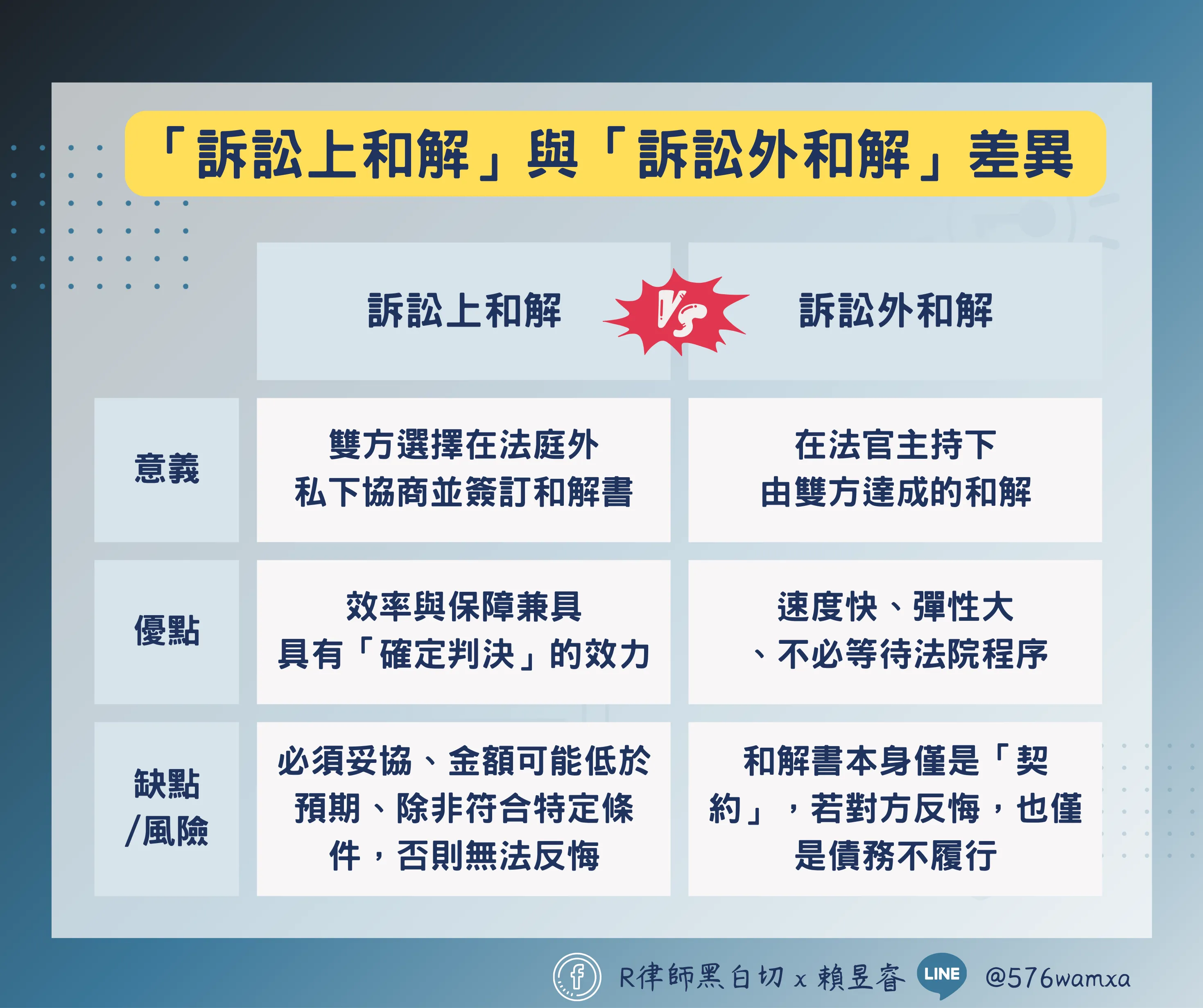 📛缺點:訴訟上和解的缺點包括必須妥協、金額可能低於預期、以及和解一旦成立就與確定判決有相同效力,除非符合特定條件,否則無法反悔。