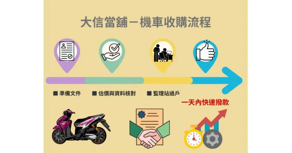 當舖收購機車的流程簡單明瞭,讓交易快速完成,以下是詳細步驟: