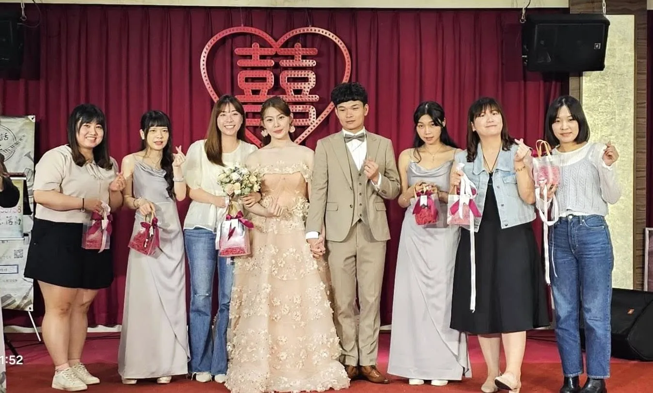 擔任護理師的新娘子與從事泥作師傅的新郎官,兩人愛情長跑五年,今天完成終身大事囉