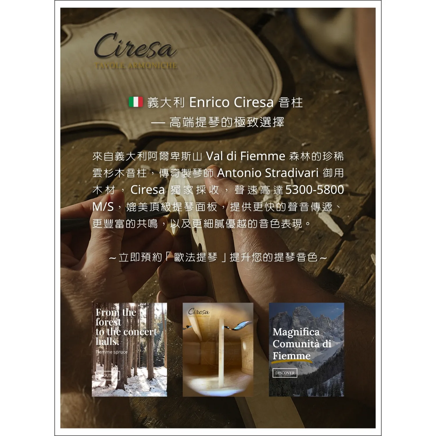 客戶的義大利小提,反應音色變差,經檢測後發現提琴音柱過短,決定更換最頂級的🇮🇹義大利 Enrico Ciresa 音柱:來自義大利阿爾卑斯山 Val di Fiemme 森林的珍稀雲杉木音柱,傳奇製琴師 Antonio Stradivari 御用木材,Ciresa 獨家採收,聲速高達5300-5800
