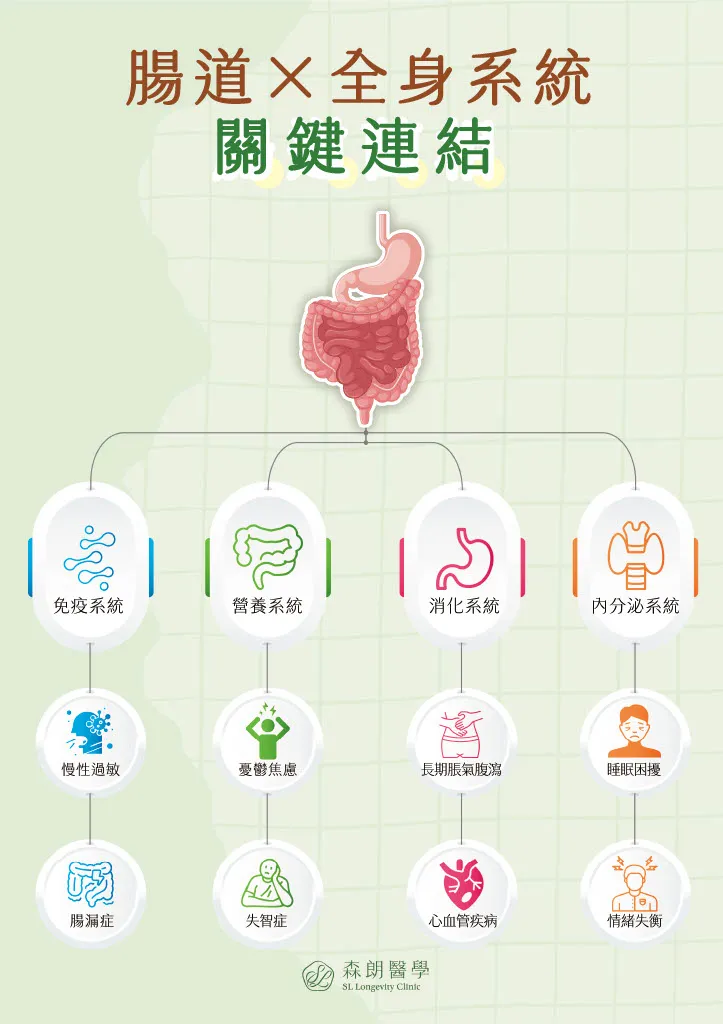 無論您幾歲,處於人生哪個階段,唯有從根本解決問題,系統化檢視健康狀態,透過以下4大核心系統評估疾病風險,並從飲食營養、情緒壓力、家族病史、生活作息、睡眠品質、工作環境、賀爾蒙變化等找到影響健康的關鍵因素,搭配專業醫療團隊整合治療計畫,才是延緩老化、預防疾病、邁向健康長壽的長久之計。腸胃疾病非單一問題,而是身體4大系統綜合表現