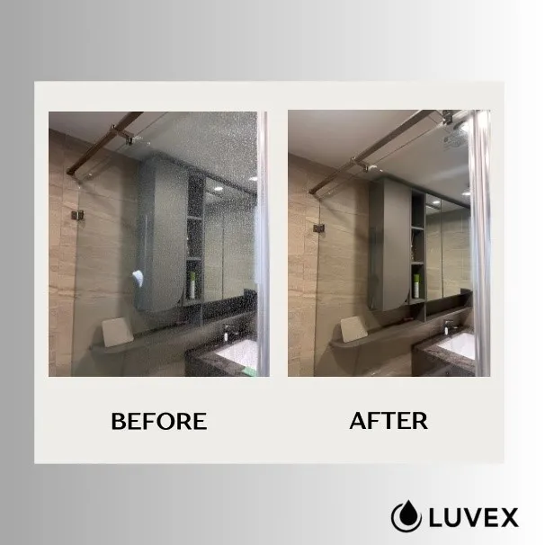 施工當天,團隊依照標準流程先進行深層清潔與除垢處理,接著在玻璃、五金與磁磚表面施作奈米級鍍膜防護層。