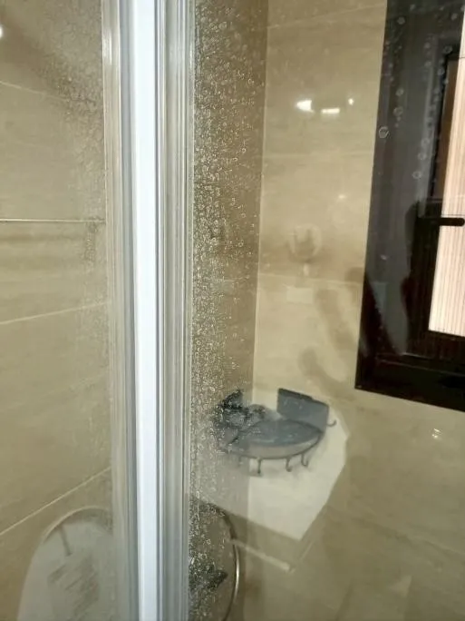 完成後,浴室玻璃恢復清透,水珠能快速滑落、不再留下痕跡。