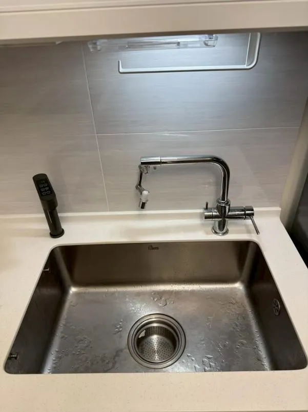 現場檢視時,我們發現雖然入住時間不長,浴室乾濕分離玻璃與廚房水龍頭已出現明顯水垢痕跡。