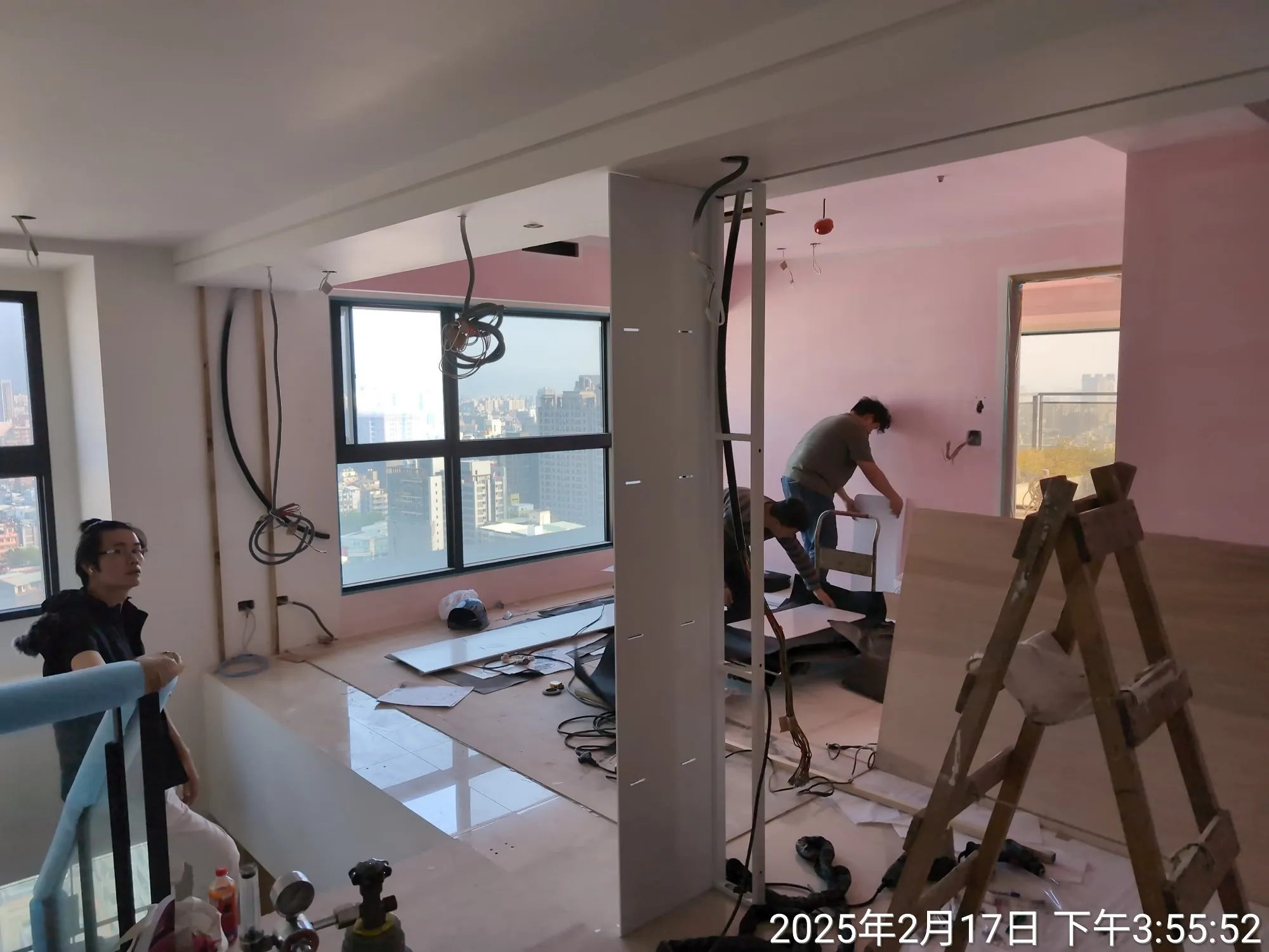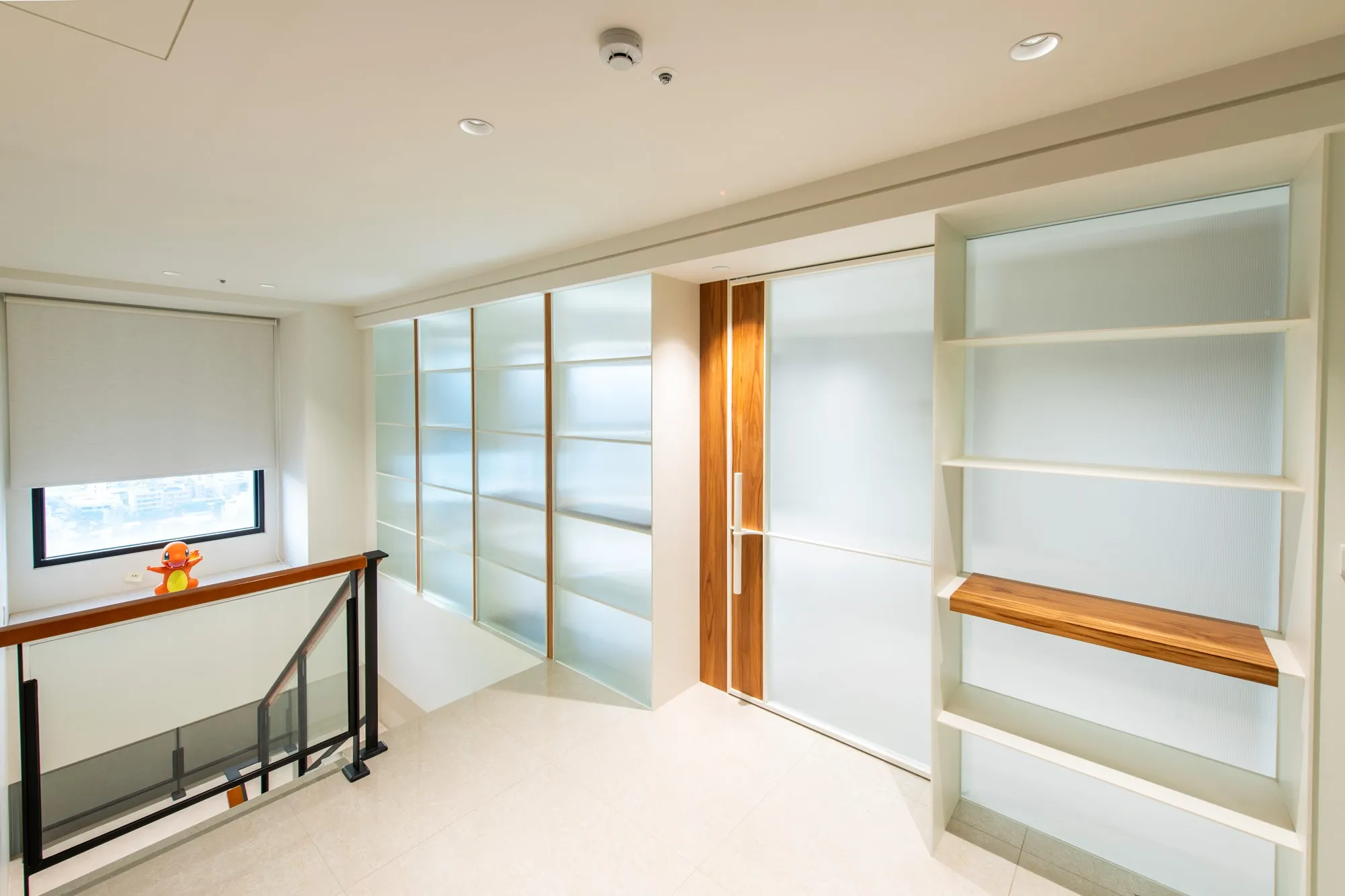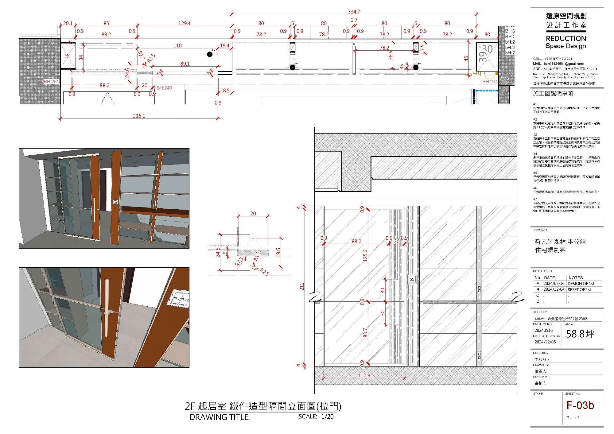 最後,透過多工種協作才得以完成的起居室鐵件隔間牆亦是一大挑戰: 為滿足隔間、採光、收納、電源控制等諸多需求,混合鐵件、木作、玻璃的結構概念隨之應孕而生。隨後在鐵工、木工、玻璃、水電工班的高度配合下,此面隔間牆分毫不差地佇立於梯間旁的放樣線上。 | |