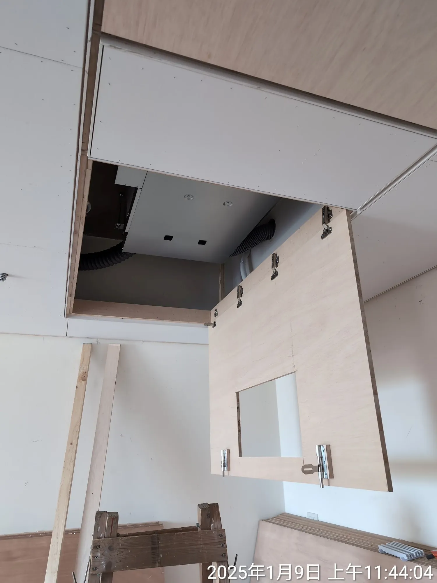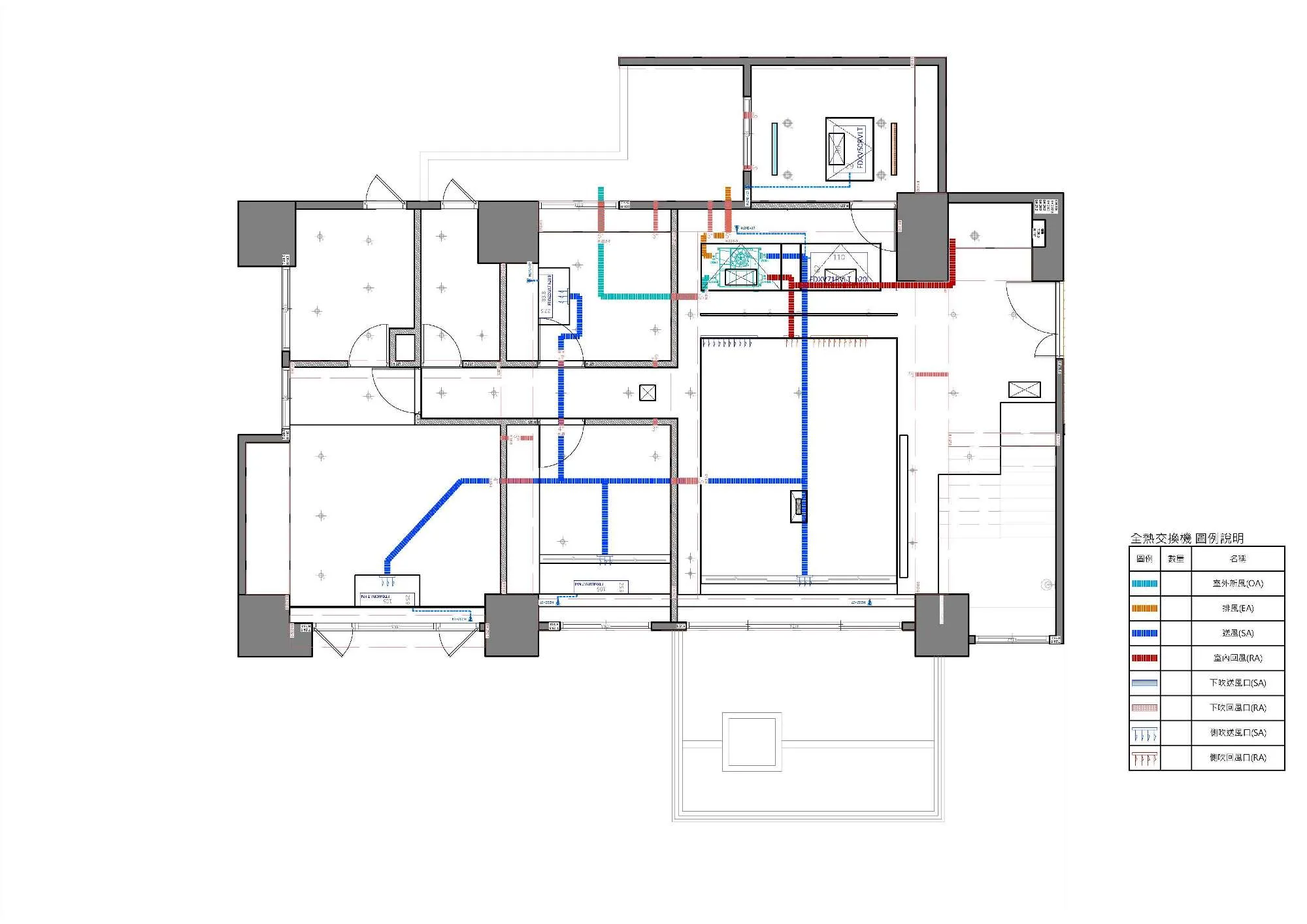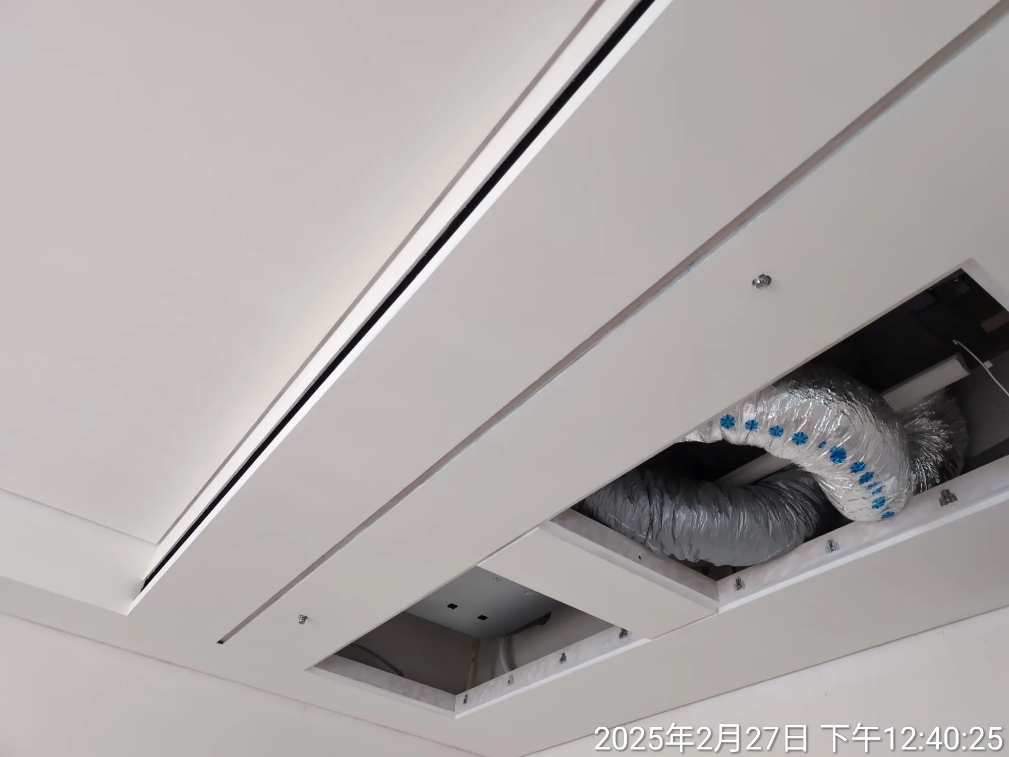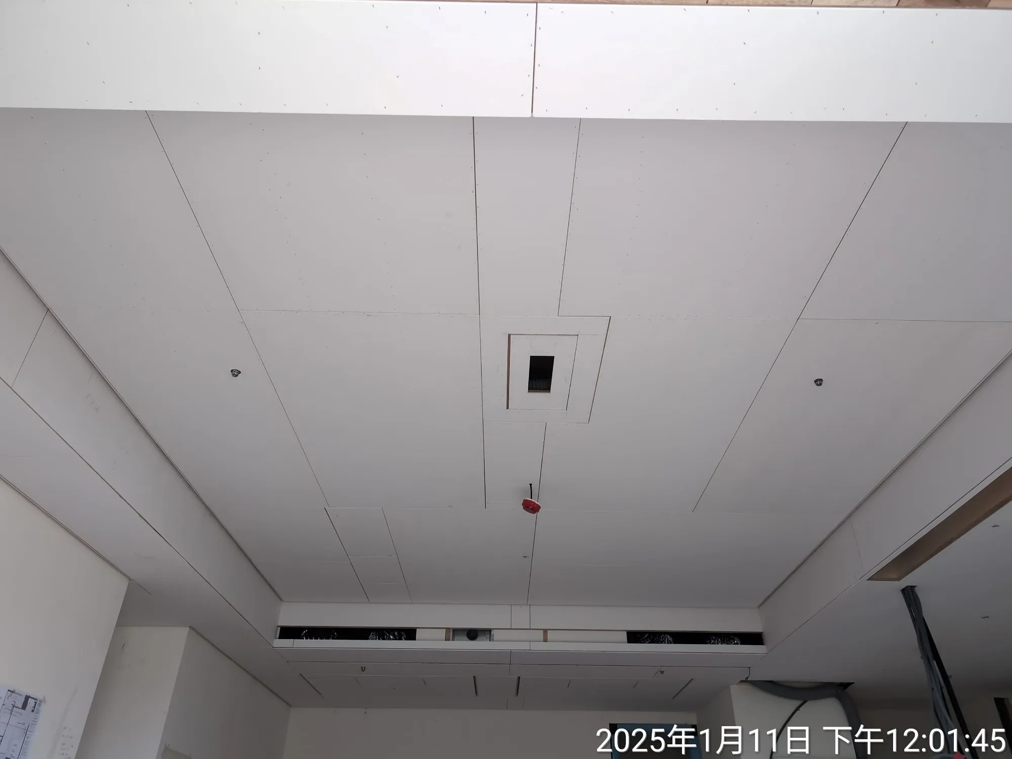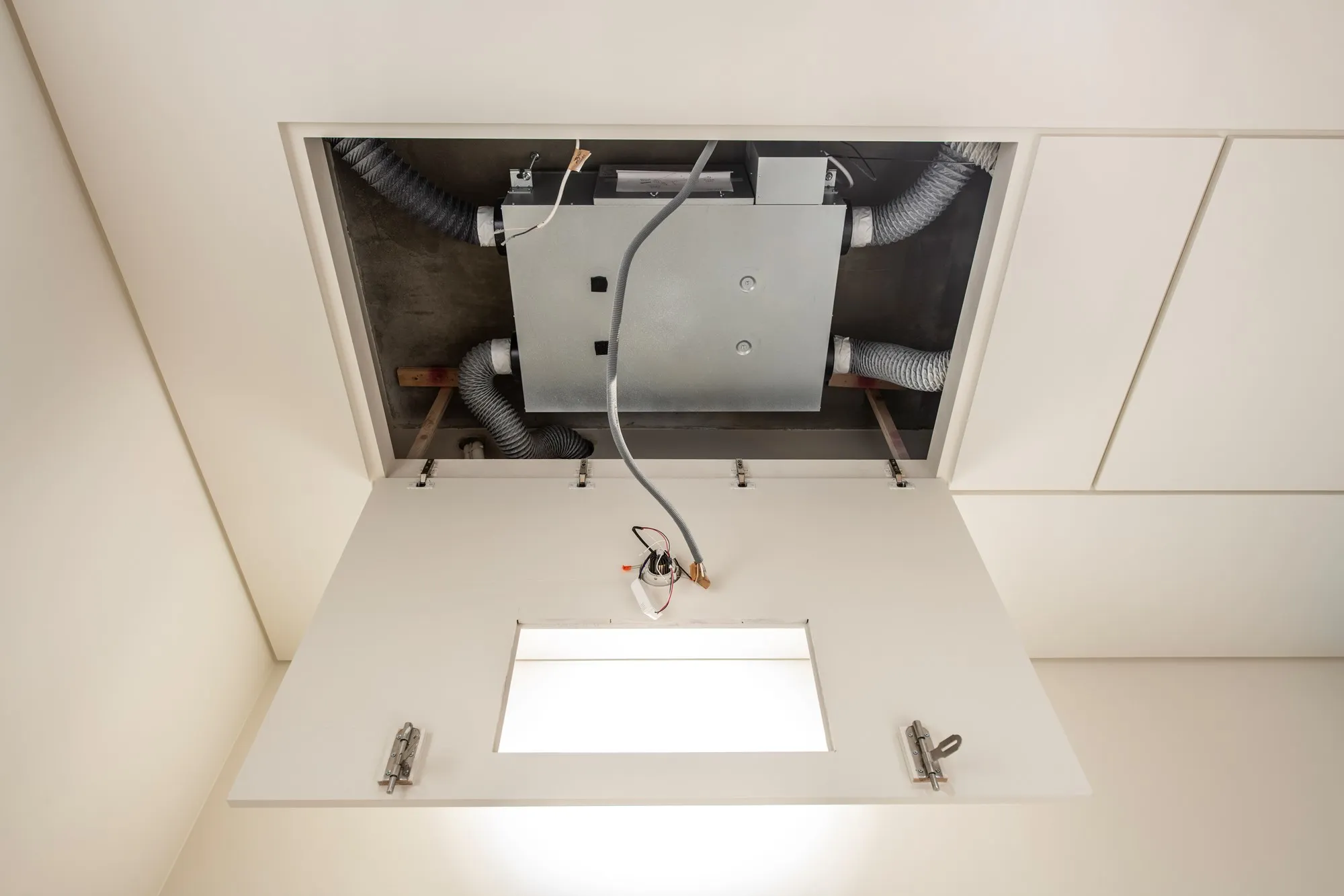 其次,吊隱式空調及全熱交換機的養護設計亦是考量重點: 有別於一般僅供保養的小型維修孔,我們為機組設計了專用下掀式大型維修孔,確保未來無需拆除天花板,即可進行整組機台的拆裝與養護。並進一步加強了周圍承重結構,以應對未來拆裝養護機組時不可避免的下壓承重需求,確保天花板的平整性。 | |