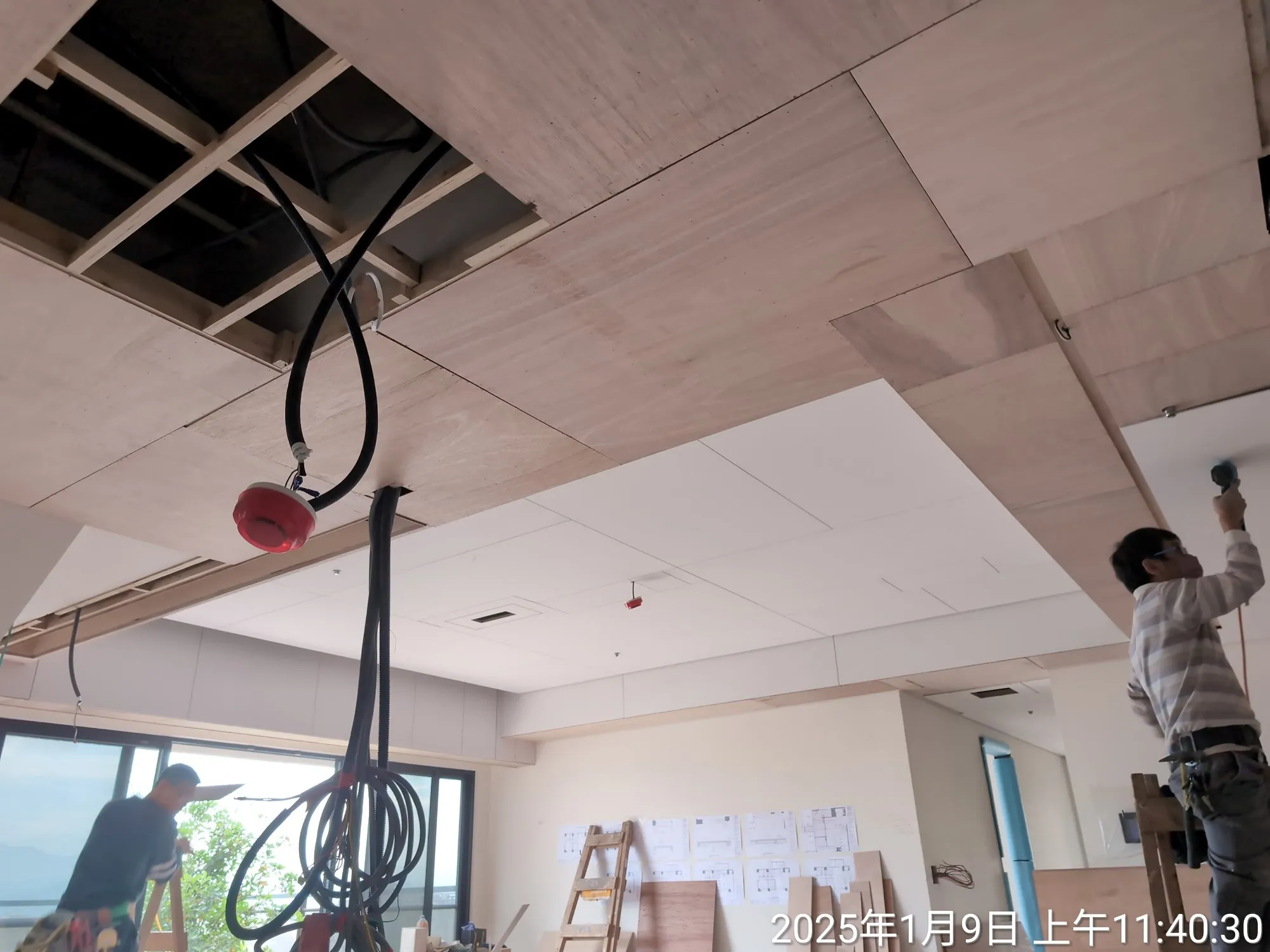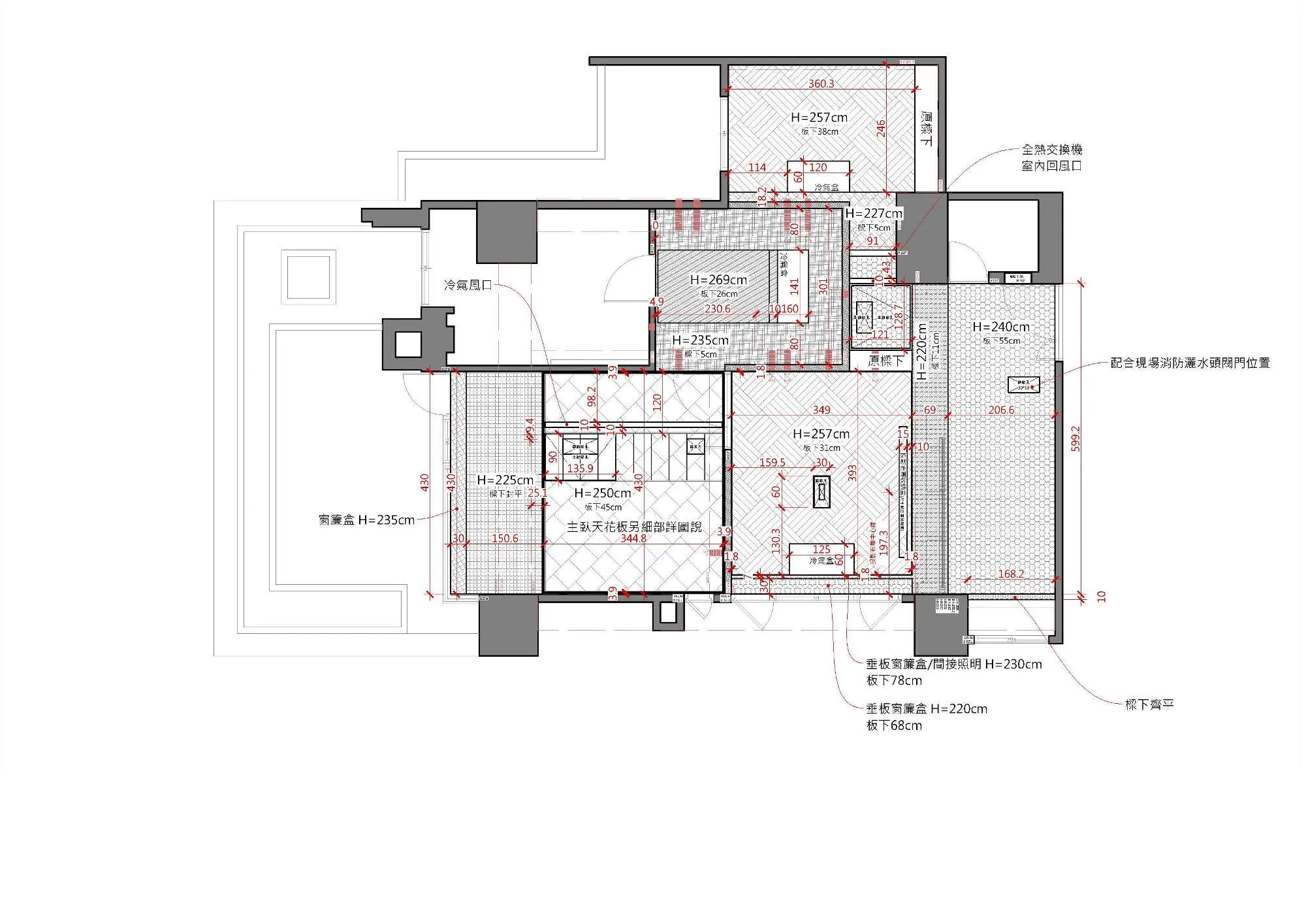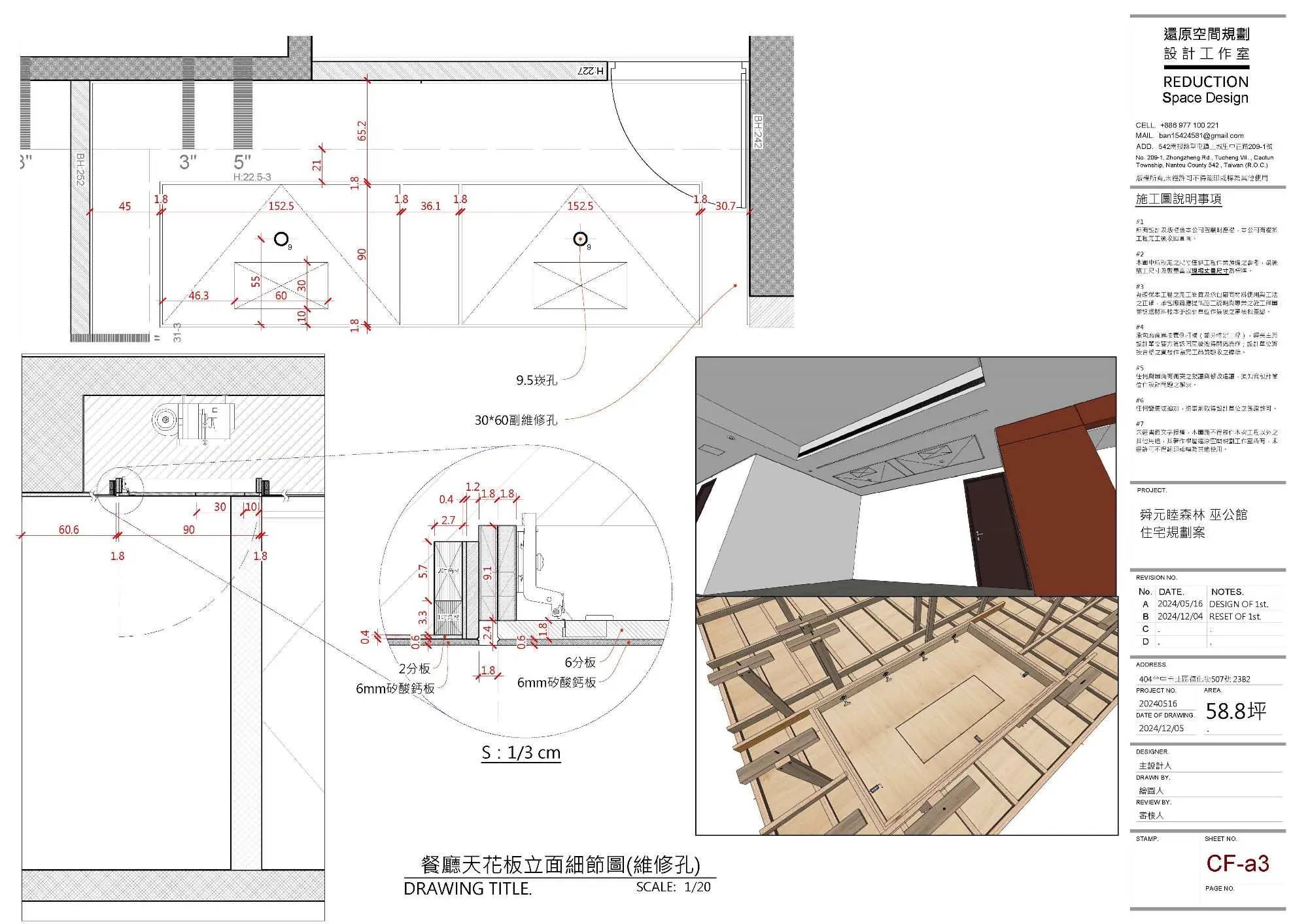 二、工程實踐:精準佈局,細節的累積 首先,天花板的木作工法是本案的施工重點: 一般常見的平釘天花板通常在3~5年後就會陸續出現微量變形與扭曲,進而影響平整性(俗稱海波浪)。但此案天花板平整性要求是至少20年,為此我們大幅調整了吊筋、縱/橫向骨架、封板的結構與固定形式,以最大限度消除扭曲及變形的可能性。 | |