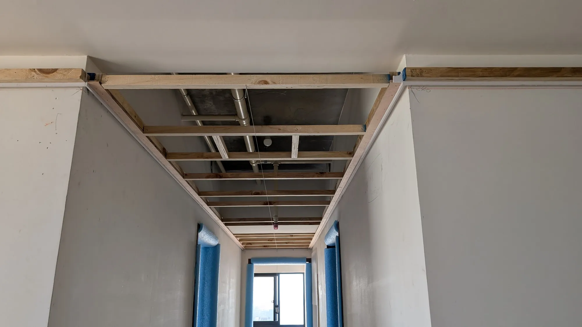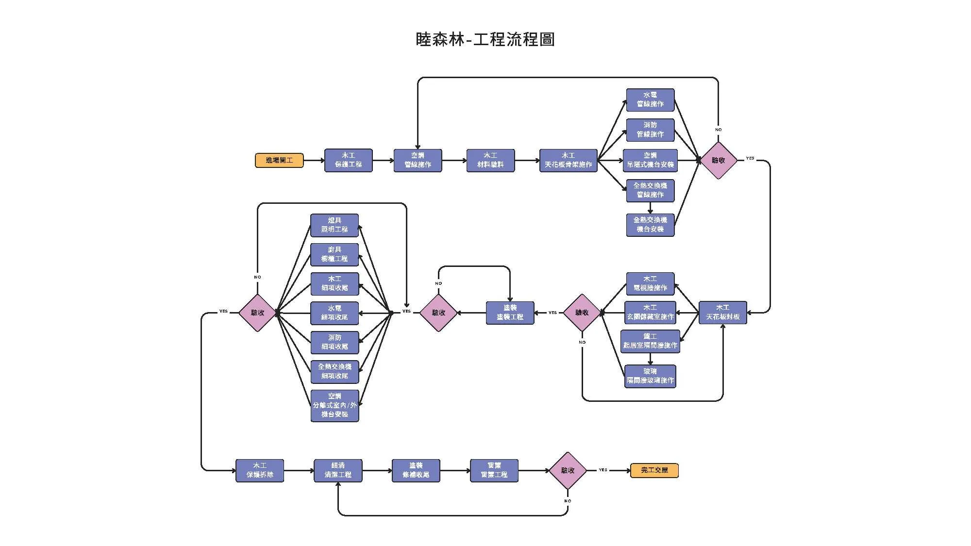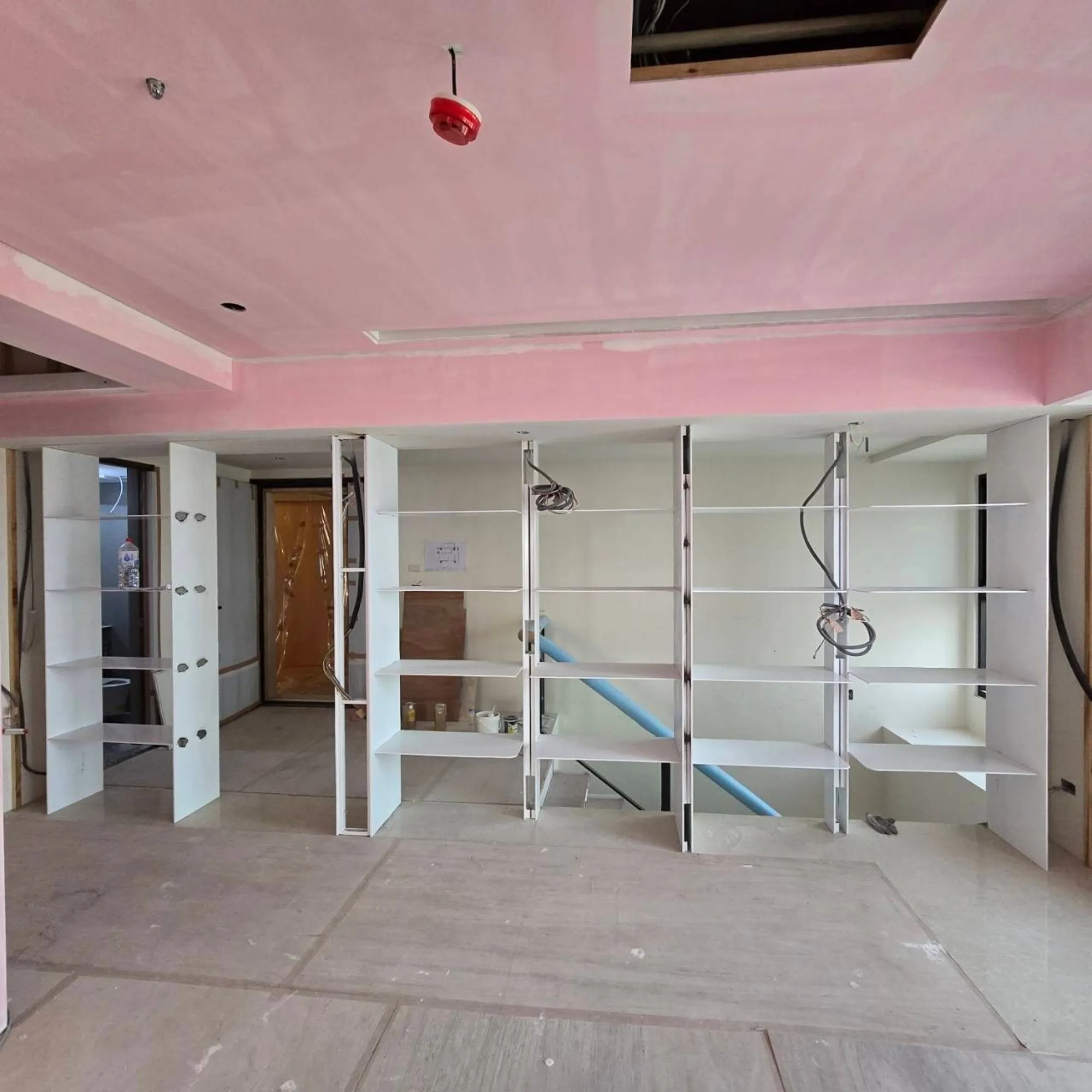 二、工程實踐:精準佈局,細節的累積 首先,天花板的木作工法是本案的施工重點: 一般常見的平釘天花板通常在3~5年後就會陸續出現微量變形與扭曲,進而影響平整性(俗稱海波浪)。但此案天花板平整性要求是至少20年,為此我們大幅調整了吊筋、縱/橫向骨架、封板的結構與固定形式,以最大限度消除扭曲及變形的可能性。 | |
