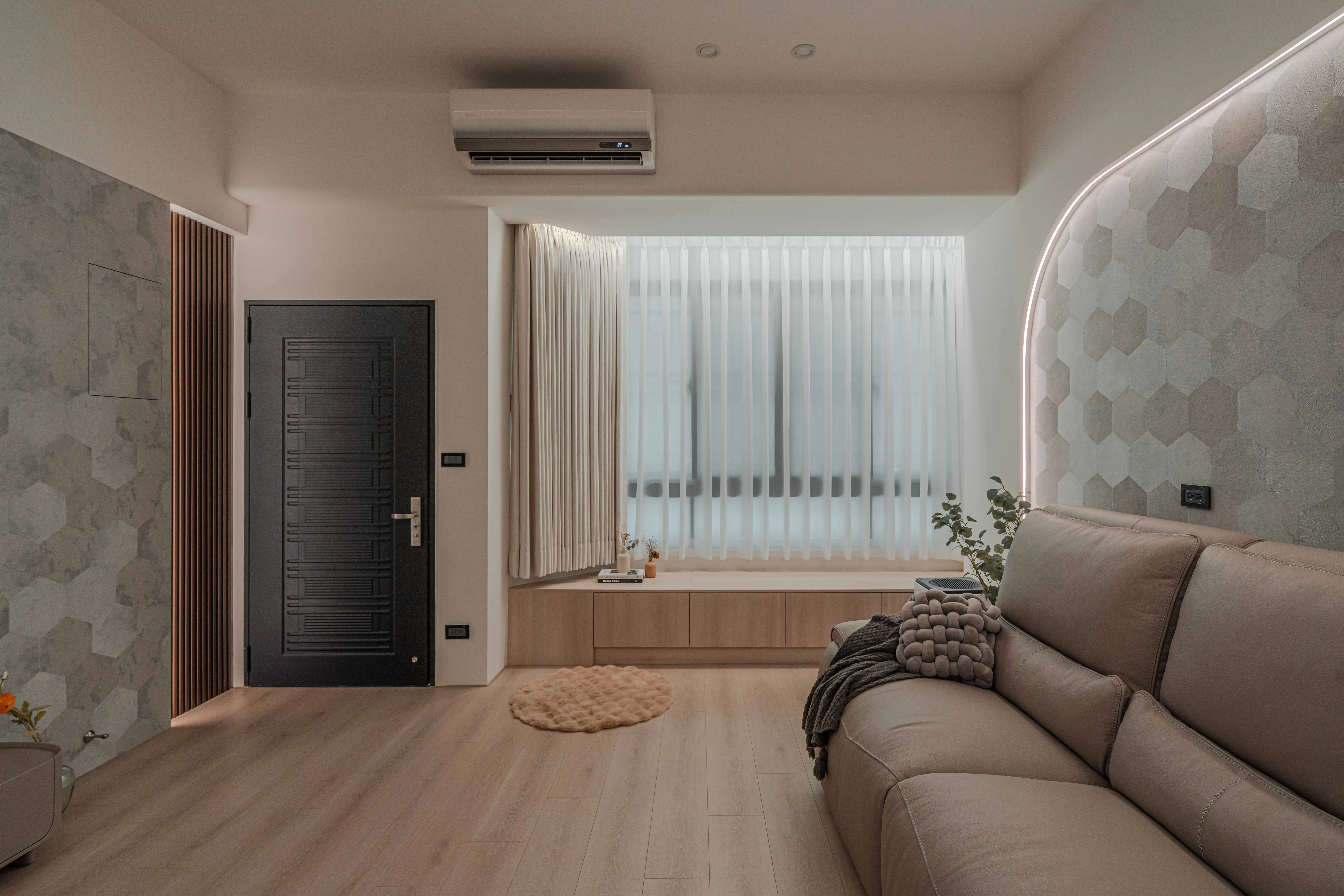 整體設計以簡約結構為主軸,壁布自然融入木作與家具配置,使空間在不過度裝飾的情況下,呈現沉穩、舒適且耐久的生活質感。 -
