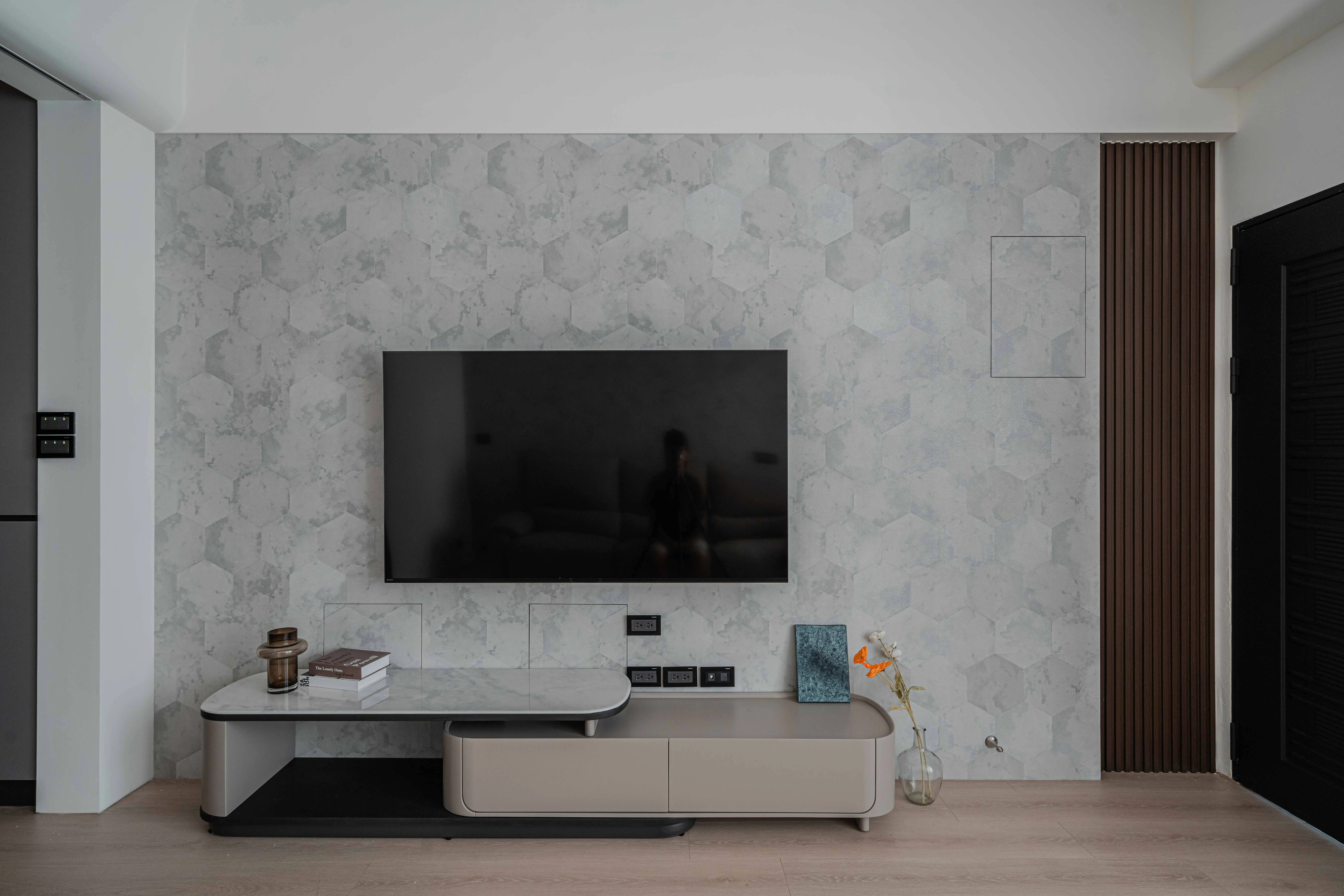 牆面以沉穩灰階為基底,幾何線條在光影變化下若隱若現,搭配柔軟沙發與簡約家具配置,使整體空間在理性結構中保有舒適溫度。