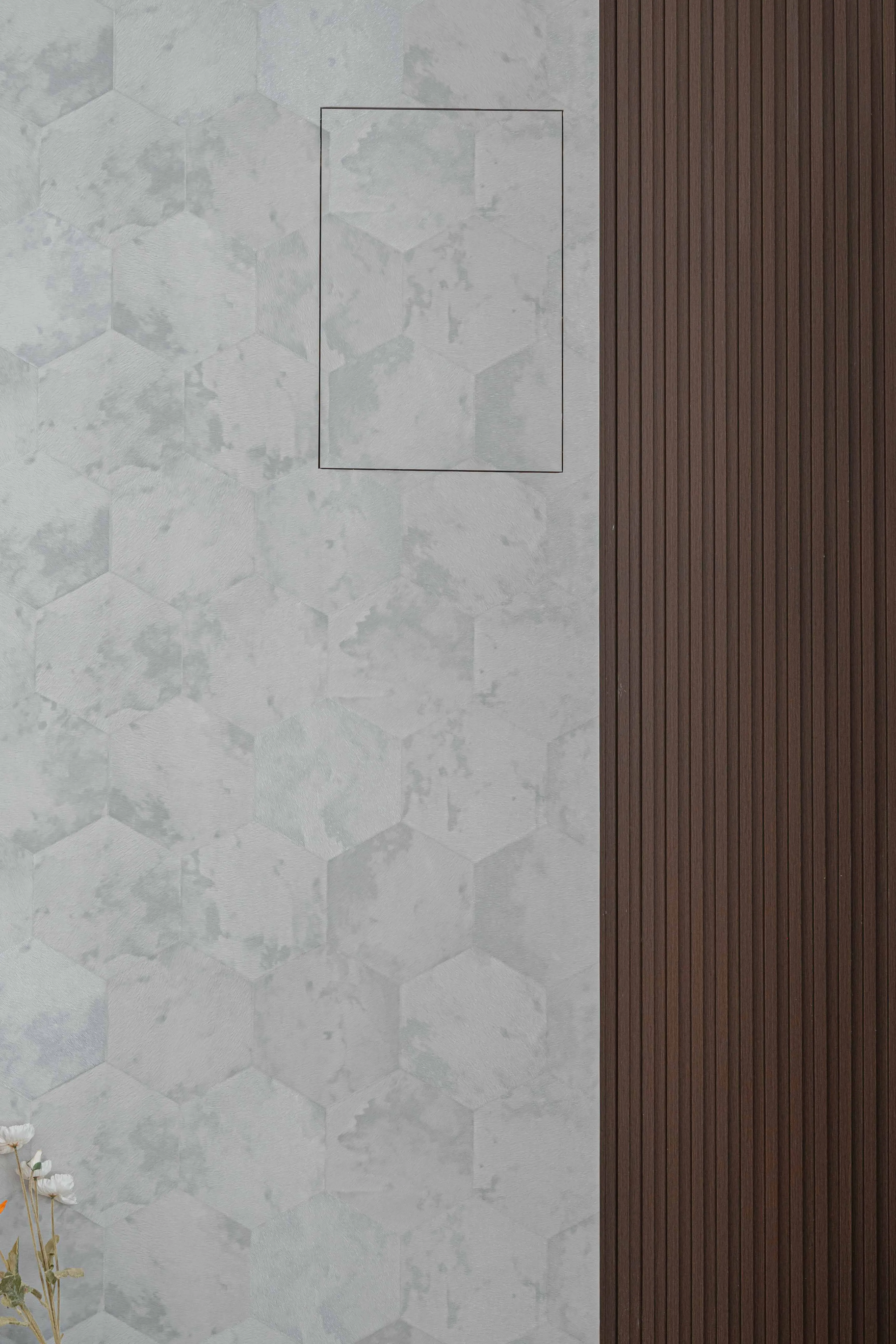 這款壁布以 幾何紋理 × 礦石肌理 × 霧面質地 為主要視覺特色: