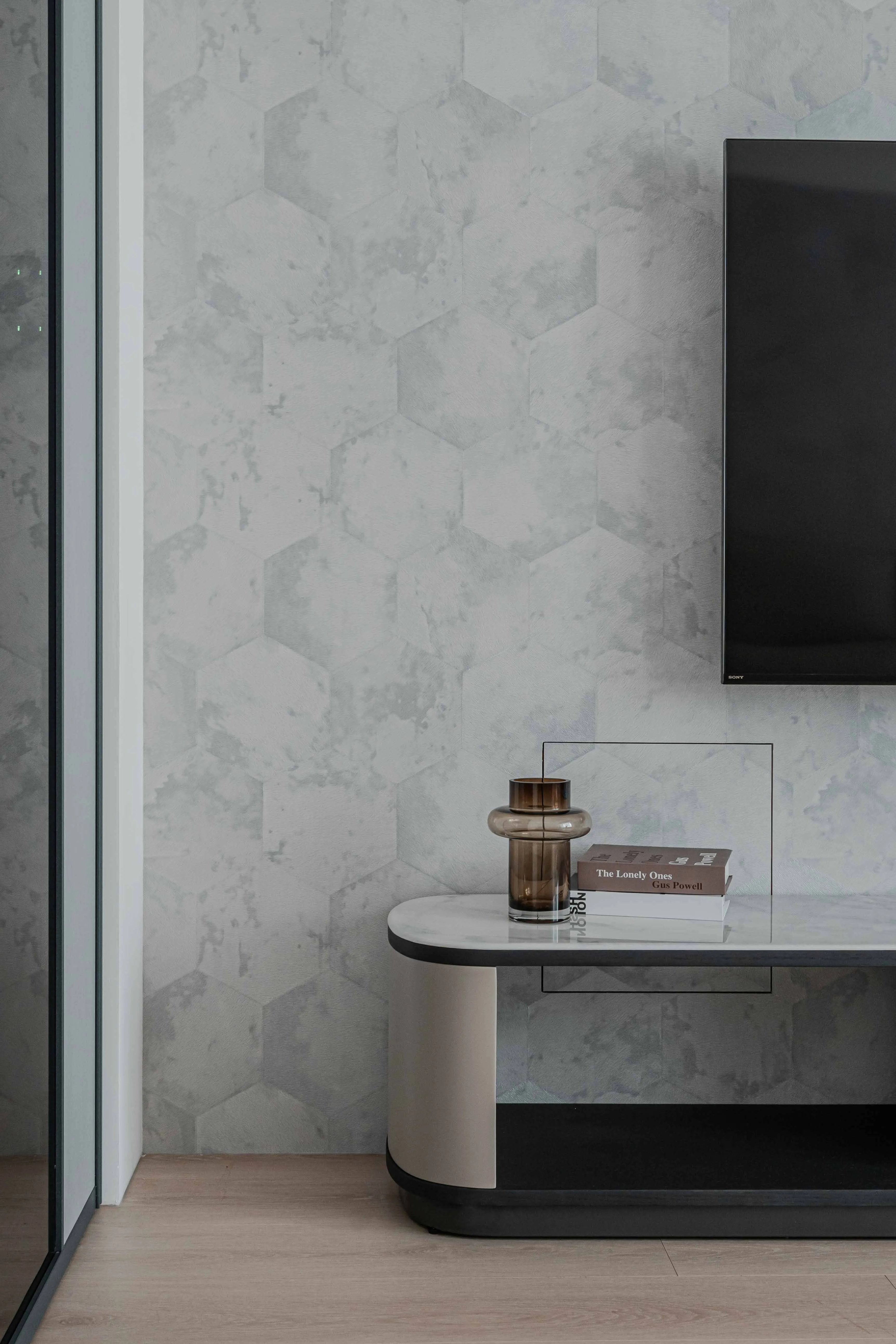 此案客廳主牆選用 Philipp Plein Z80006 壁布 作為空間視覺焦點,透過 幾何構成結合礦石質感的設計語彙,為空間注入低調卻鮮明的個性。