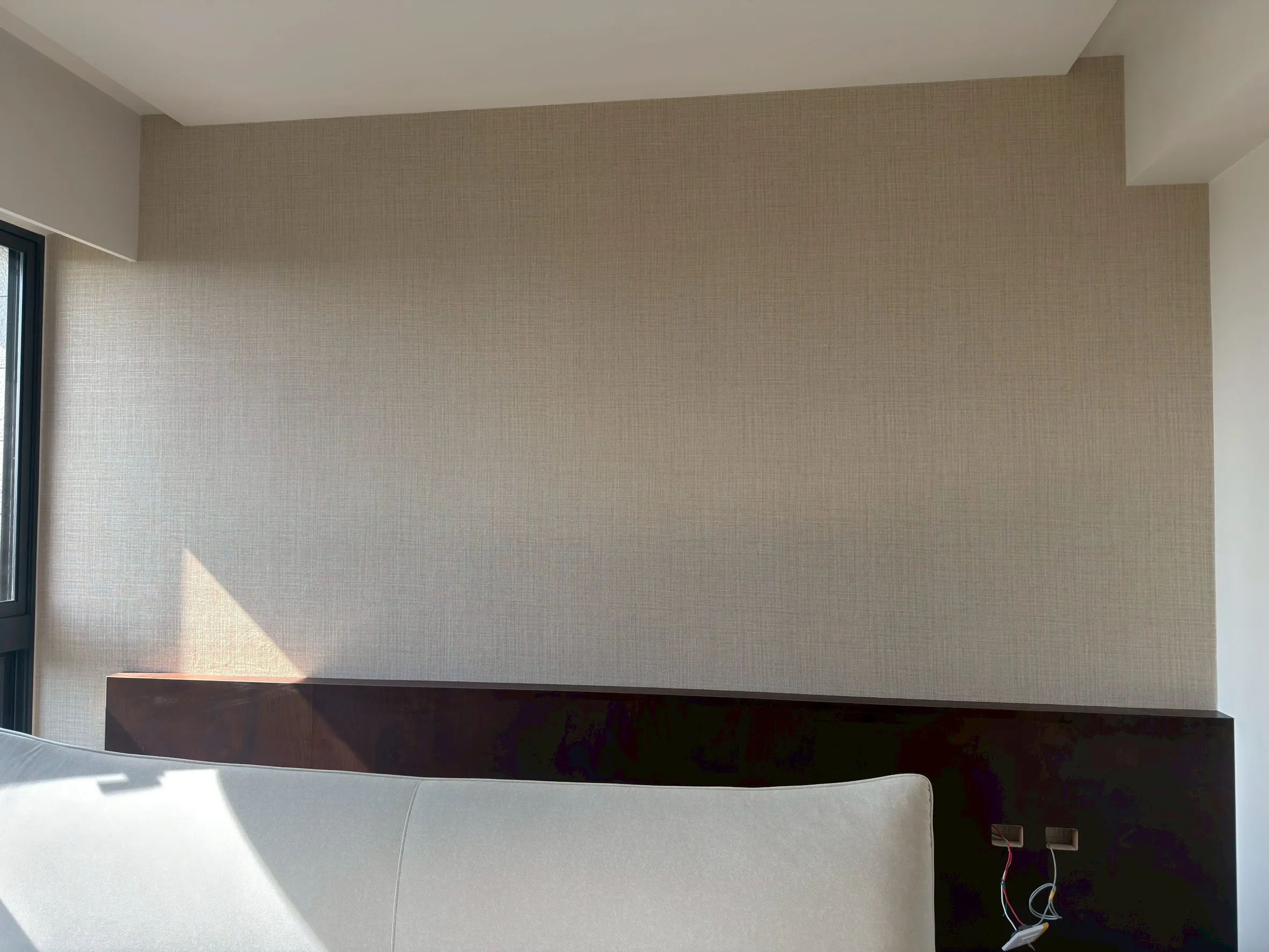 於牆面轉角、插座與邊緣位置精準裁切與收邊,確保壁布紋理連續、視覺俐落,呈現高完成度的牆面效果。