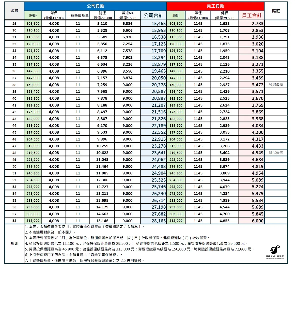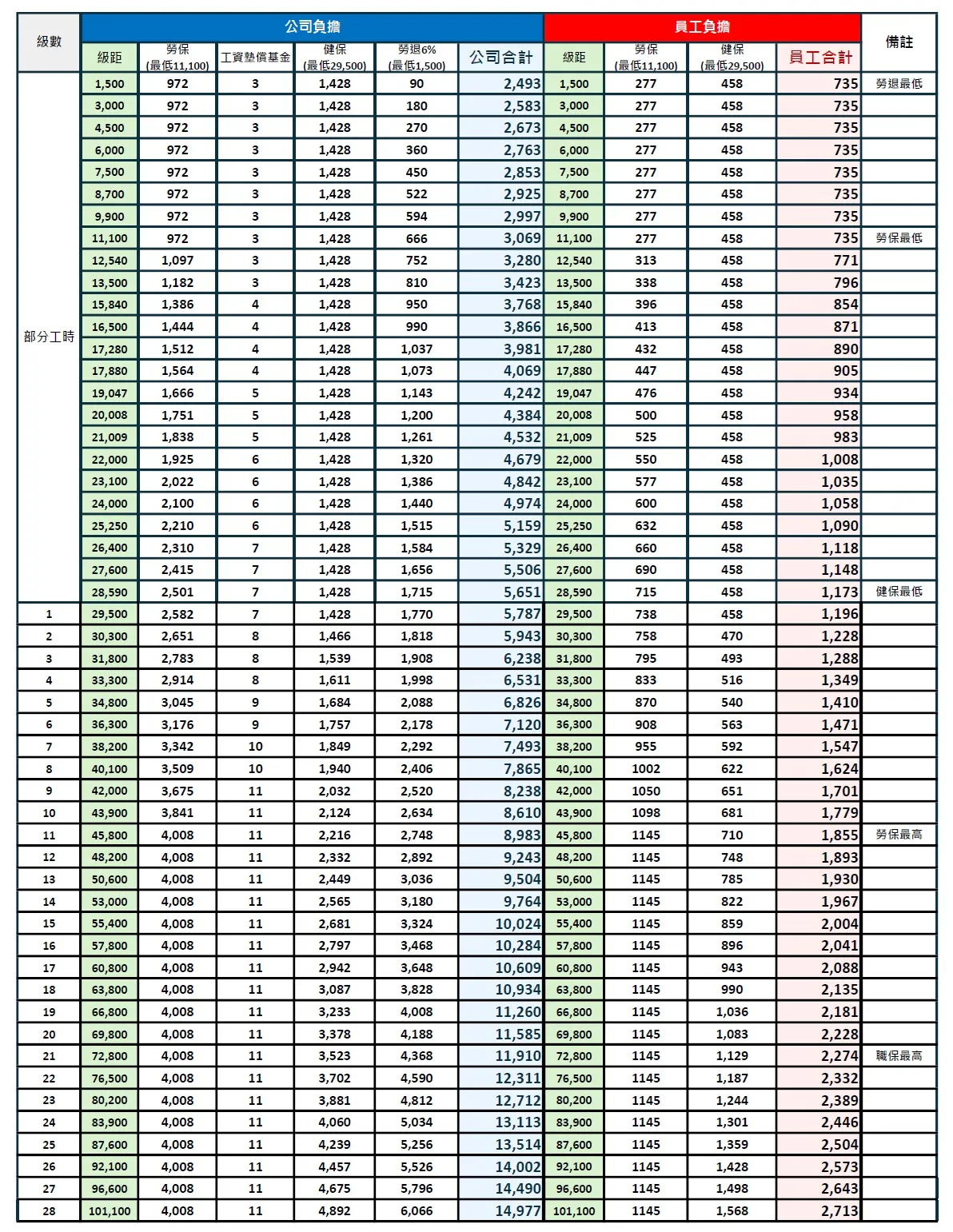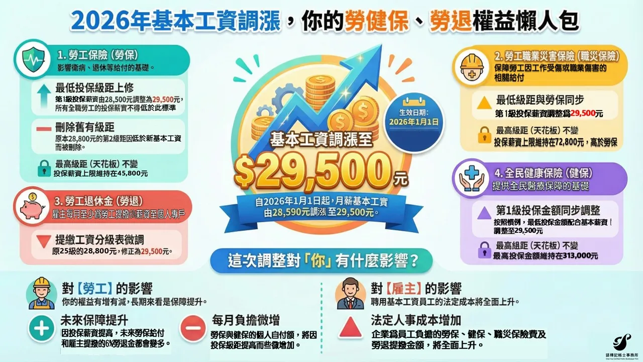 影響項目: 勞工保險(勞保)、勞工職業災害保險(職災保險)、勞工退休金(勞退)月提繳分級表,以及全民健康保險(健保)投保金額分級表
